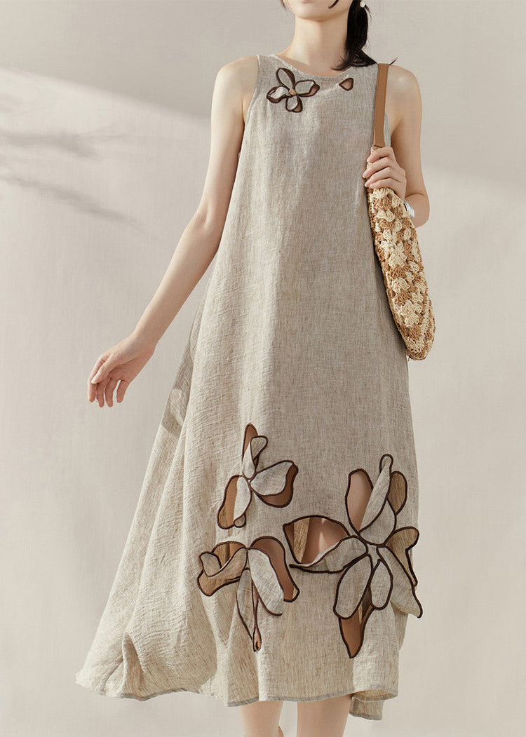 2025 New Khaki Floral Hollow Out Maxi Dresses Short Sleeve