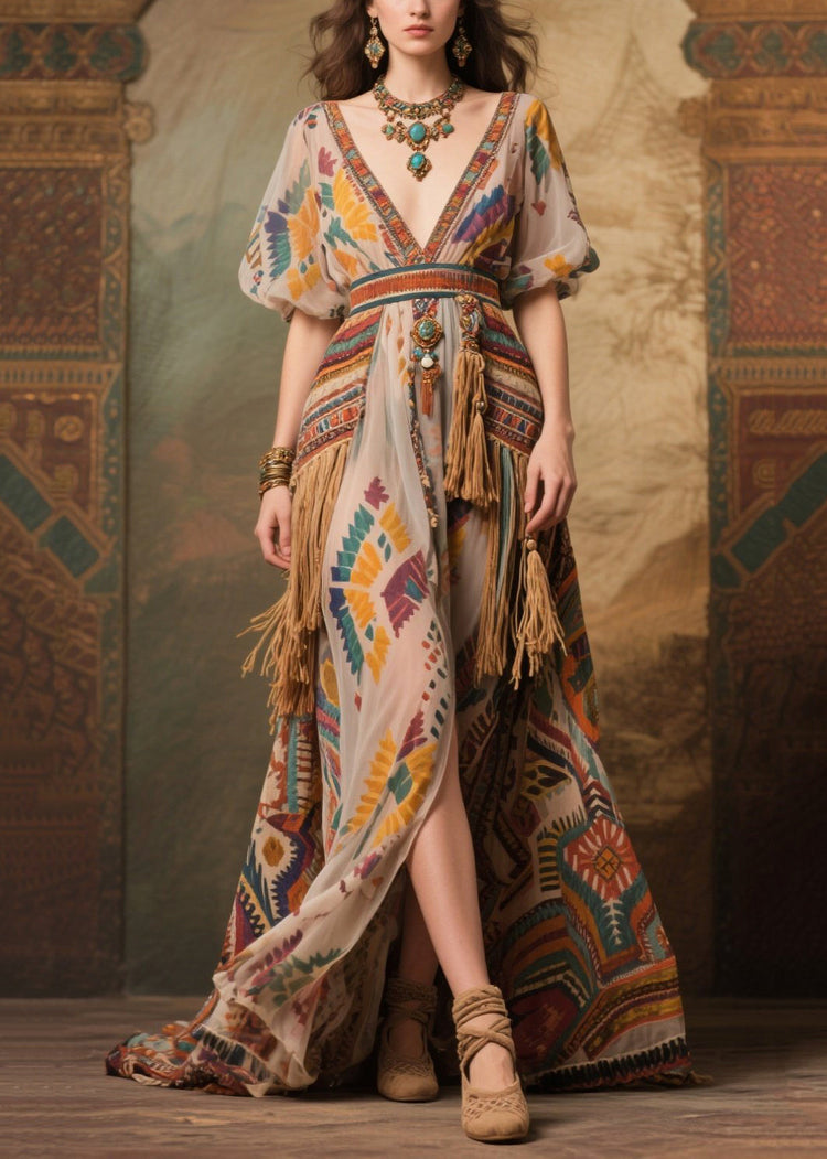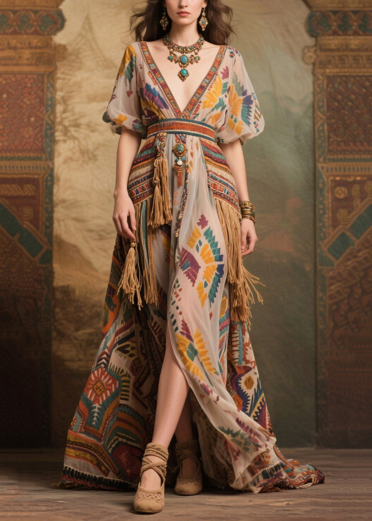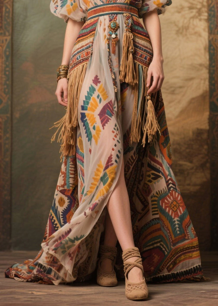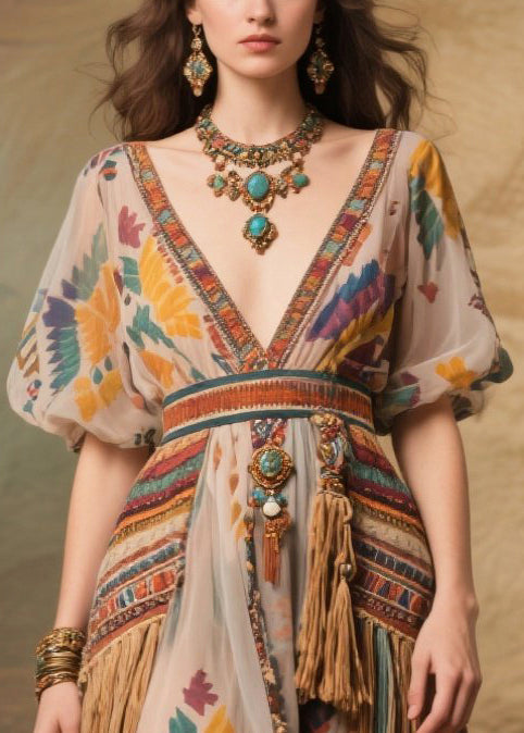 Apricot Tasseled Chiffon Party Dresses Exra Large Hem Puff Sleeve