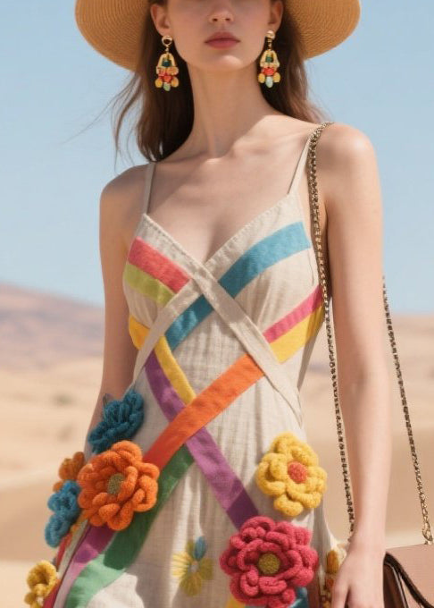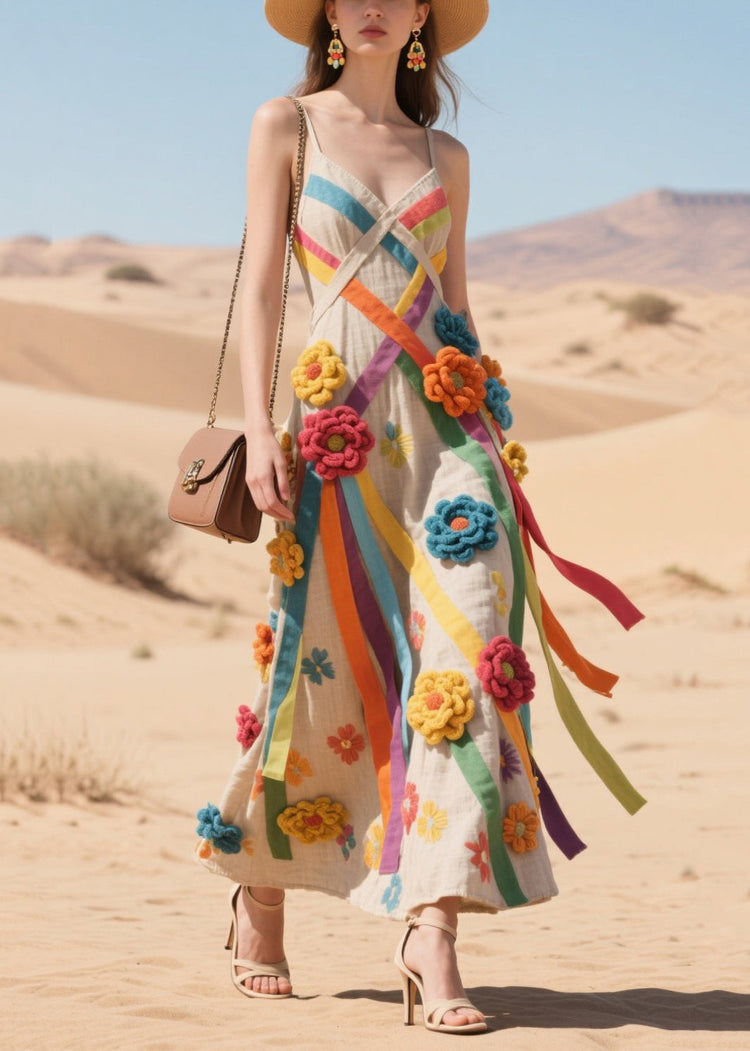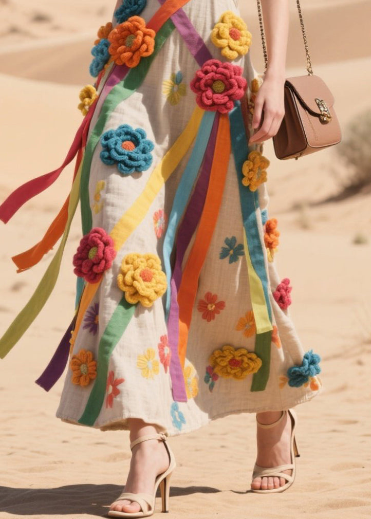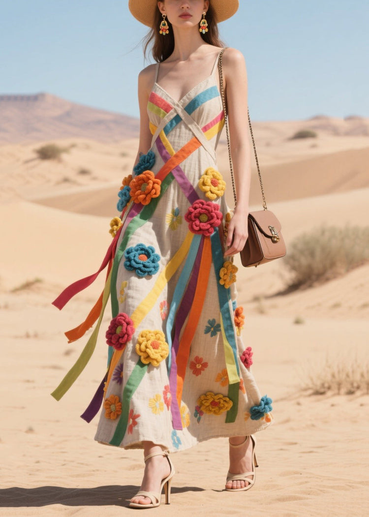 Art Multicolour Floral Decorated Ribbon Cotton Sundress Summer