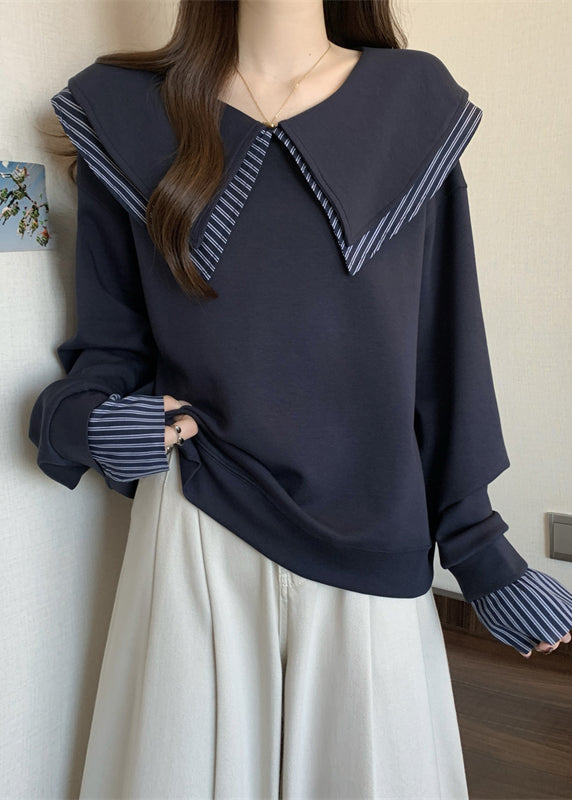 Art Navy Double-layer Patchwork Striped Cotton Sweatshirts Top Fall