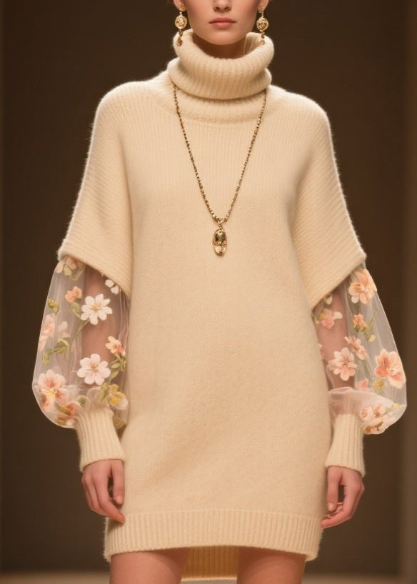 Beautiful Beige Hign Neck Tulle Patchwork Knit Dress Winter