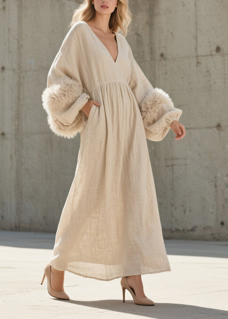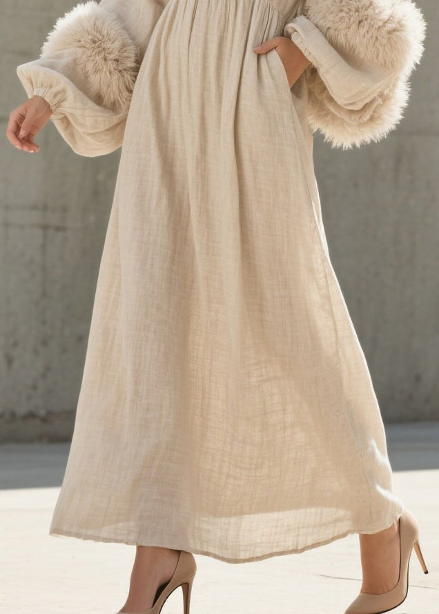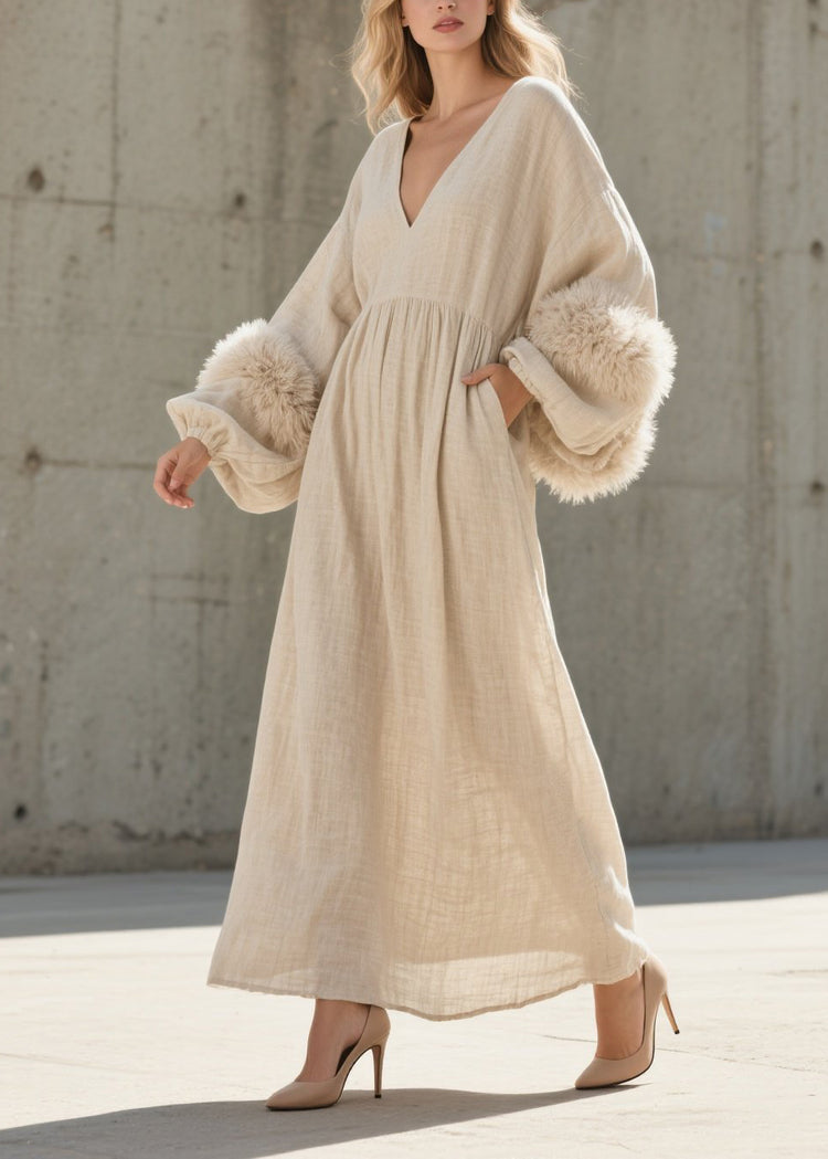 Beautiful White V Neck Patchwork Faux Fur Ankle Dress Lantern Sleeve