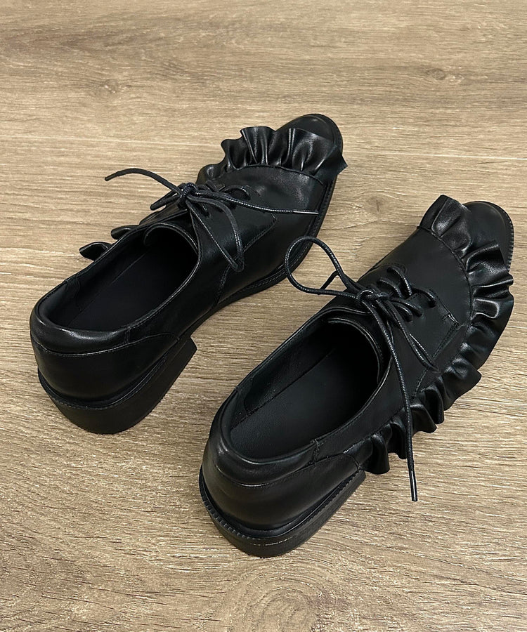Black Lace Up Cowhide Leather Ruffled Splicing Flat Shoes