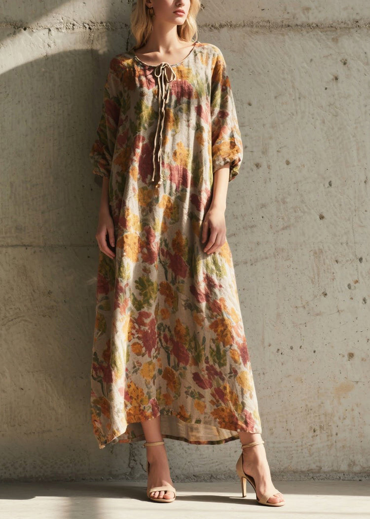 Boho Khaki Tie Neck Print Cotton Holiday Dress Summer