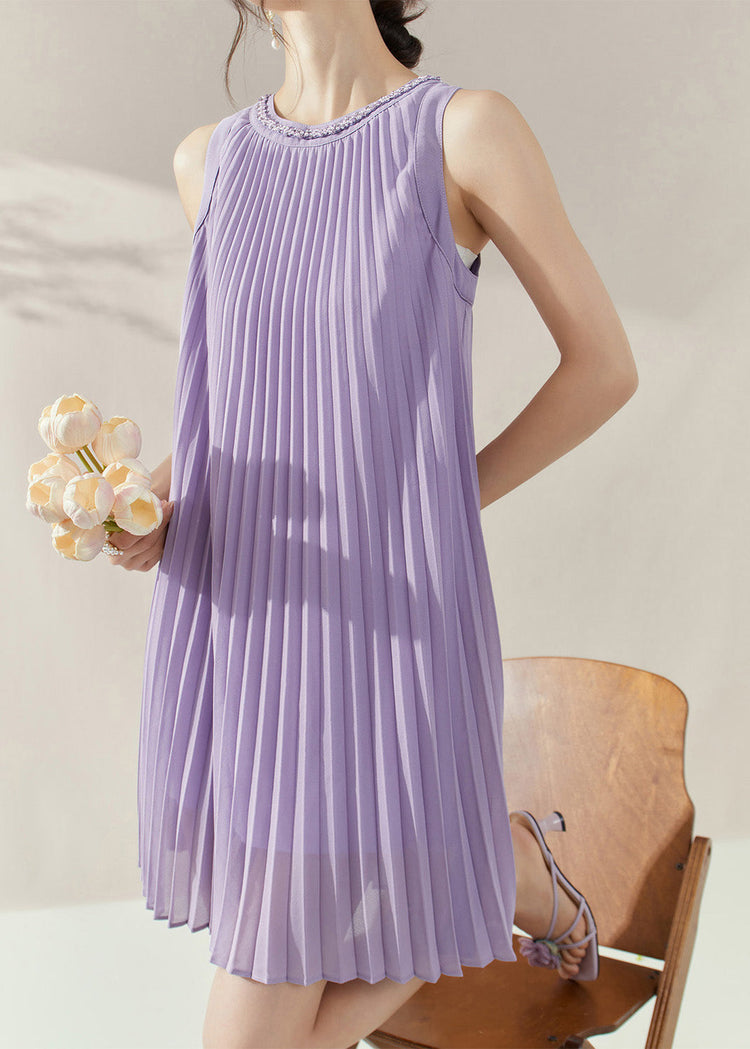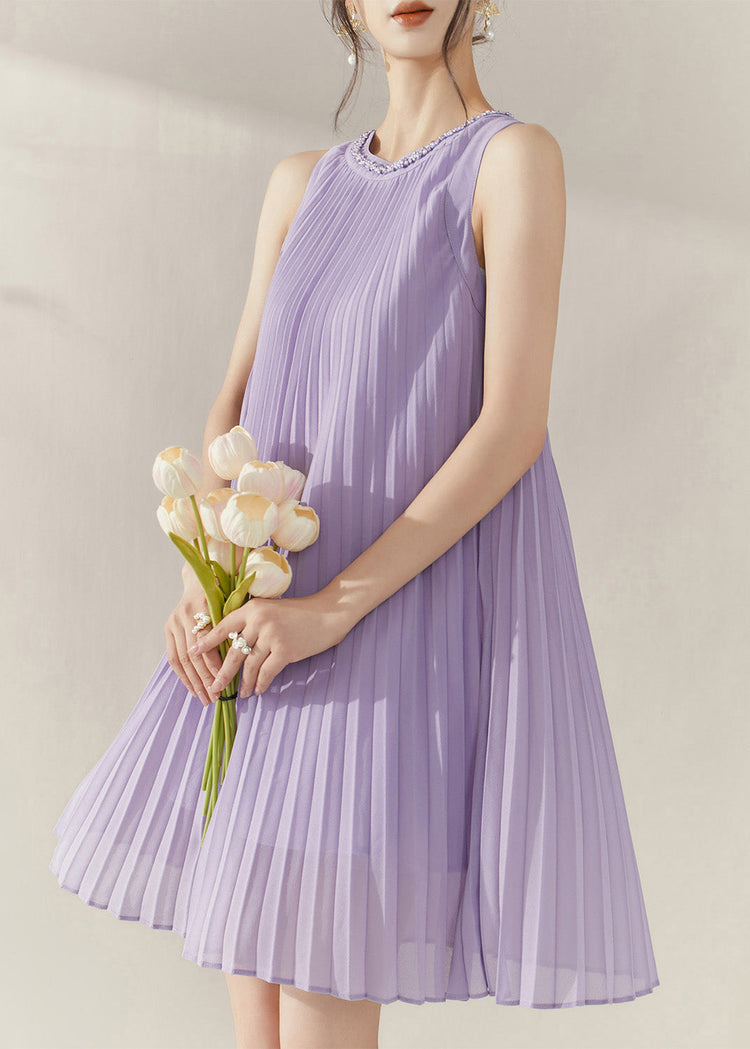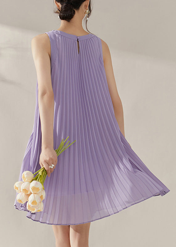 Boho Purple O-Neck Wrinkled Chiffon Mid Dress Summer