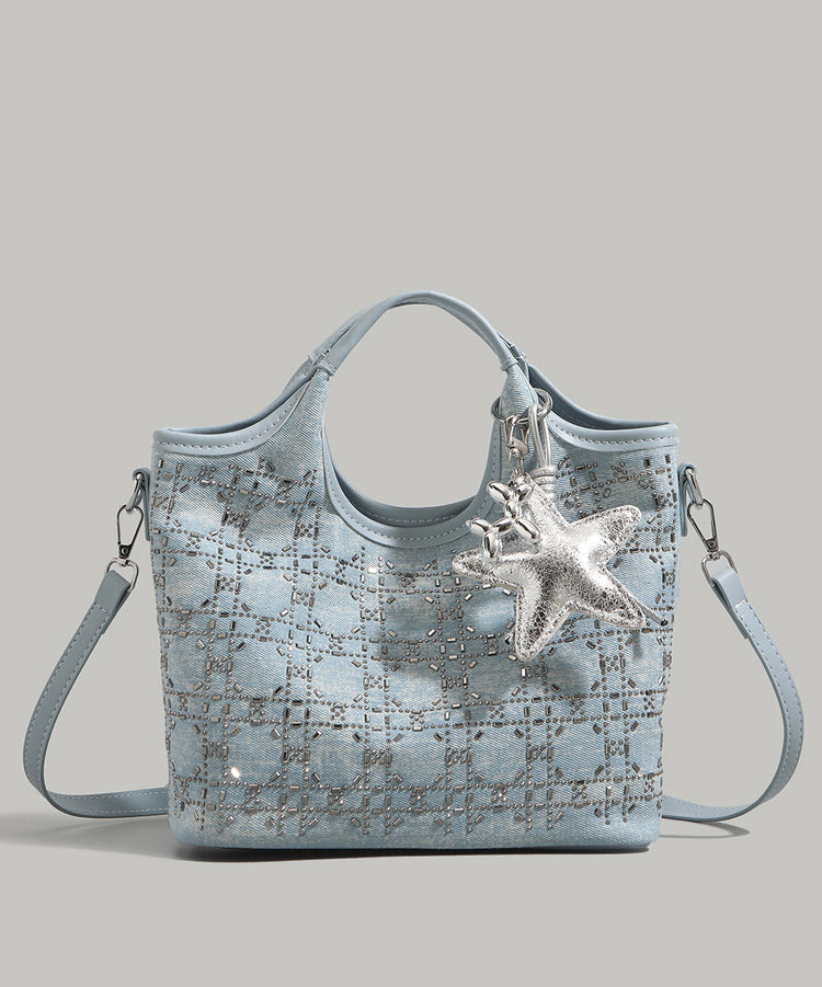 Boutique Denim Blue Rhinestone Star Decorated Cotton Tote Handbag