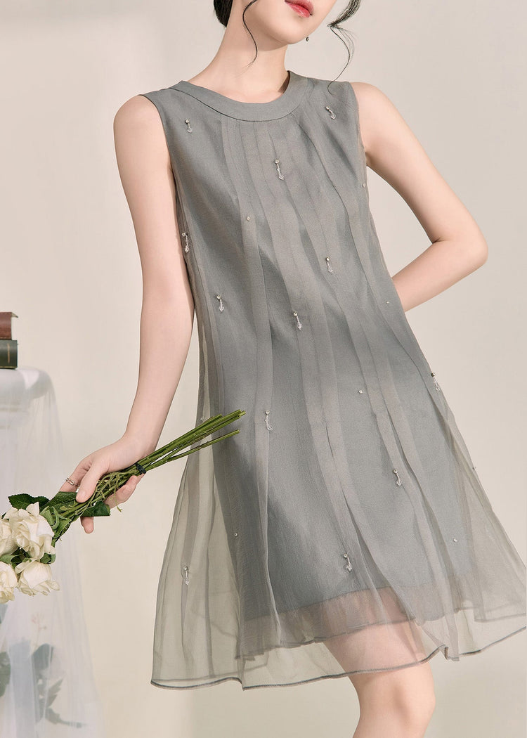 Boutique Grey O-Neck Patchwork Tulle Mid Dress Summer