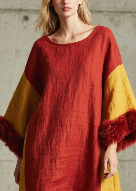 Boutique Red Oversized Patchwork Faux Fur Maxi Dresses Fall