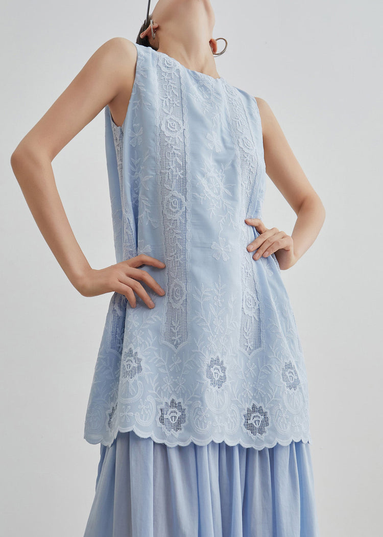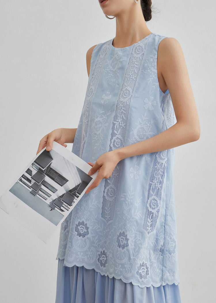 Casual Blue Embroidered Hollow Out Fake Two Pieces Long Dresses Sleeveless