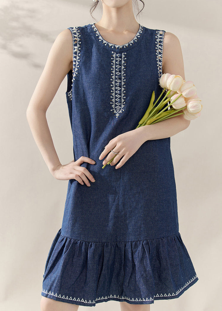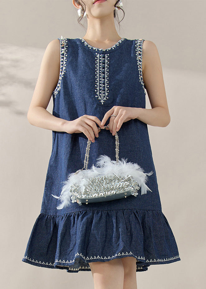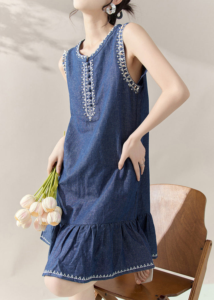 Casual Blue Print Patchwork Denim Mid Dresses Sleeveless