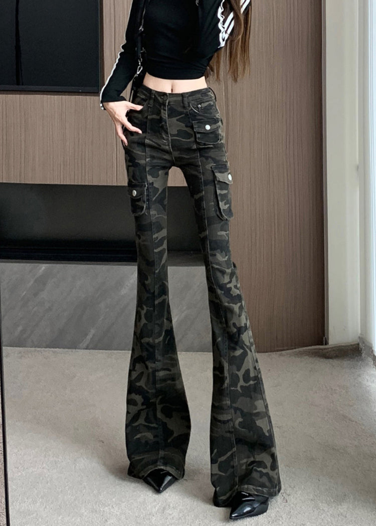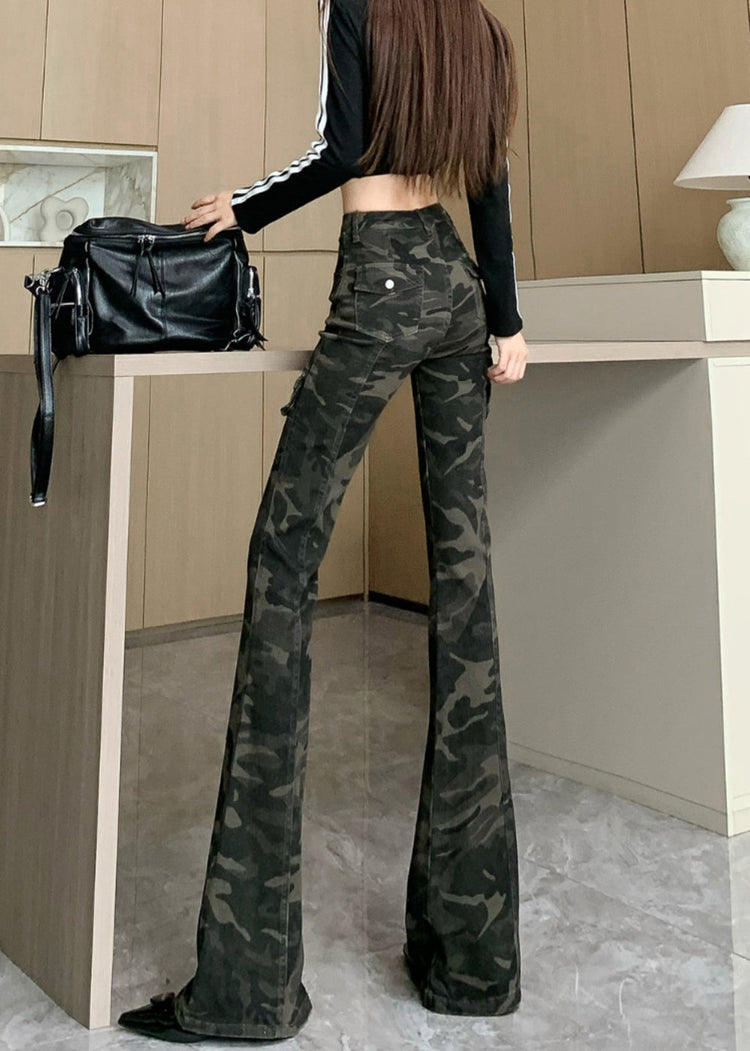 Chic Camouflage Green Silm Fit Denim Flared Trousers Fall