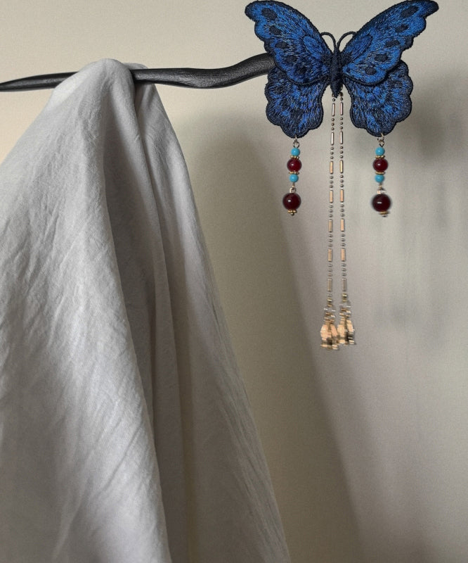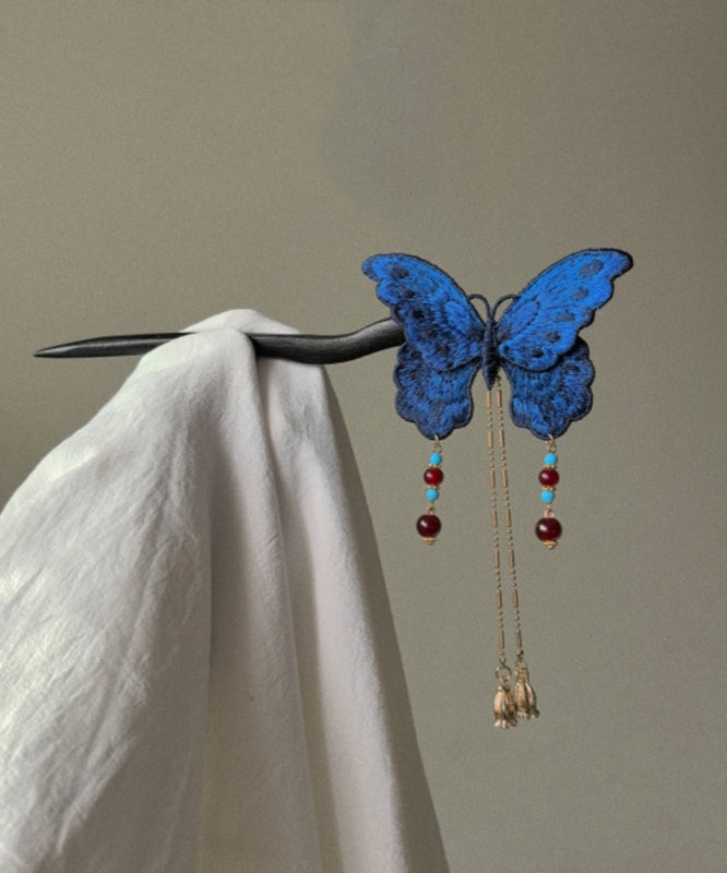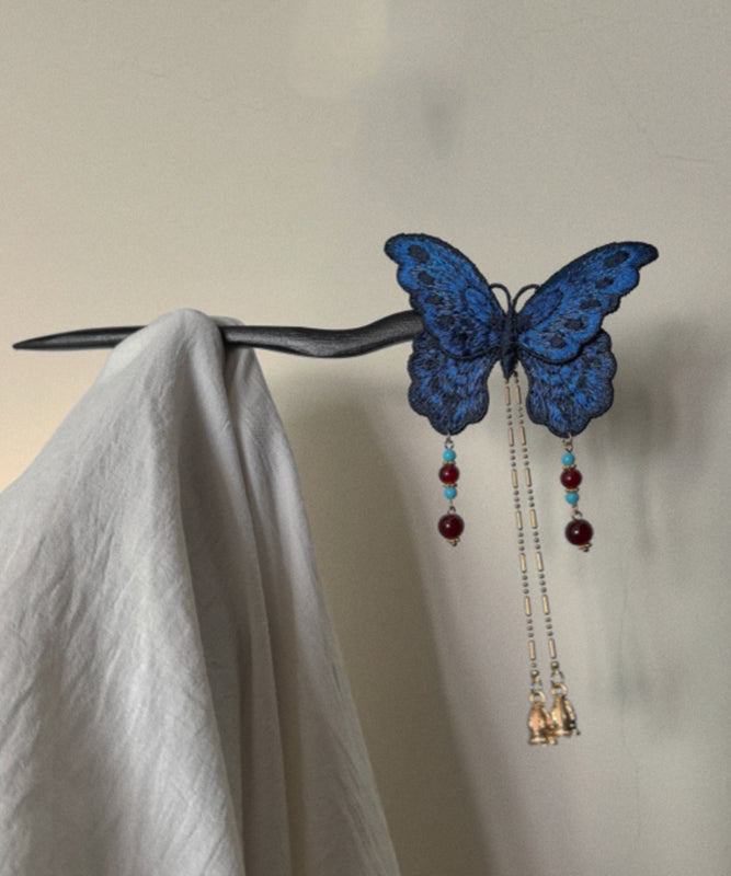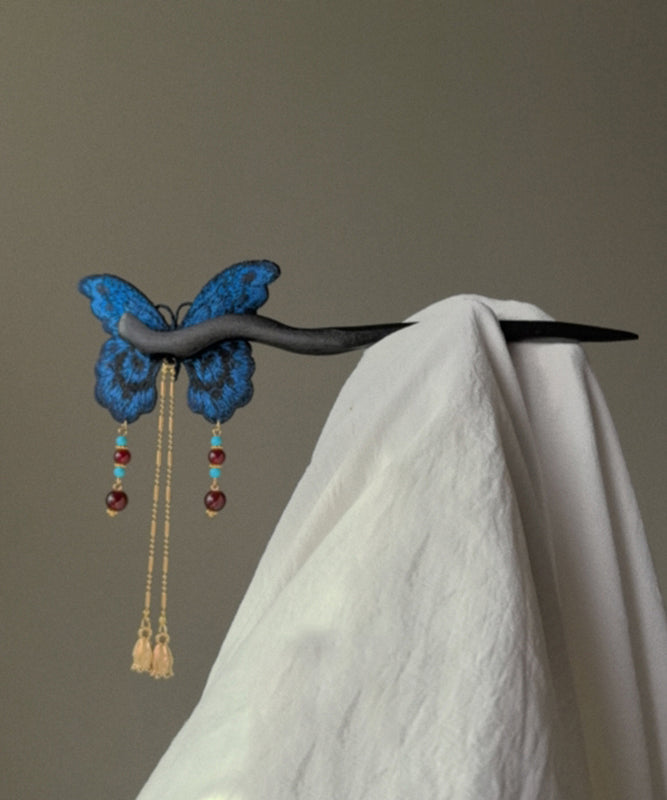 Chinese Style Blue Wooden Butterfly Embroidery Tassel Hairpin