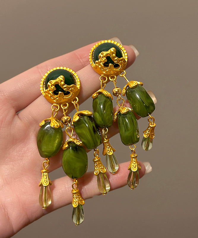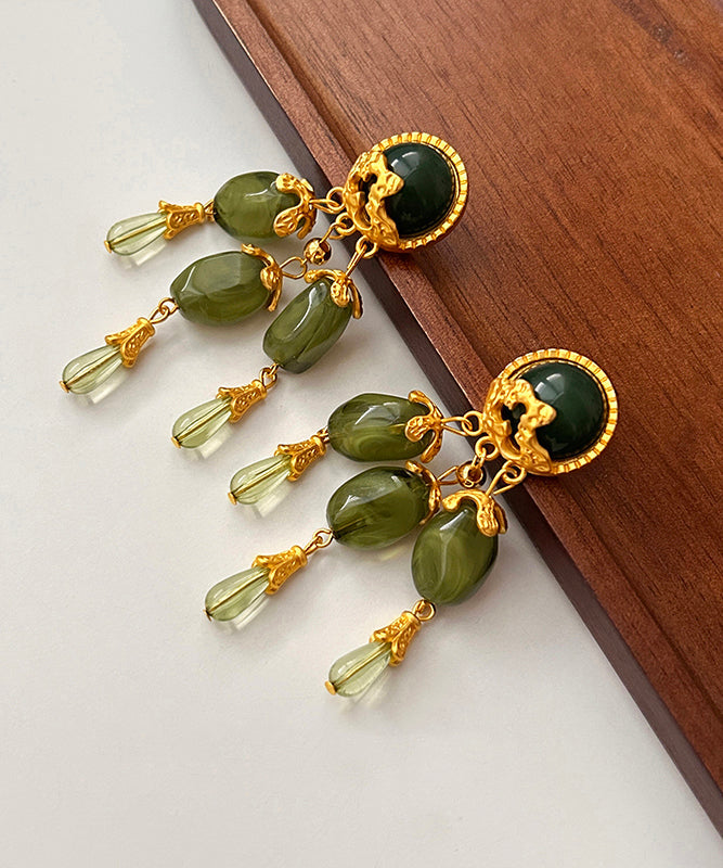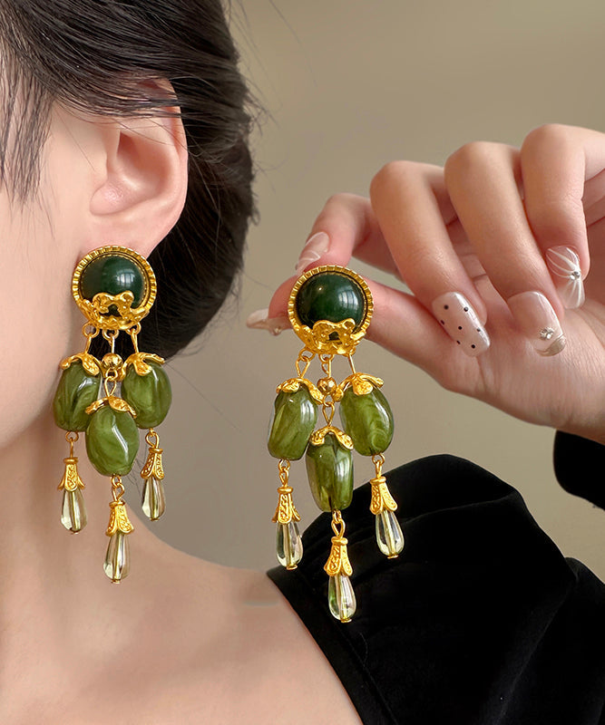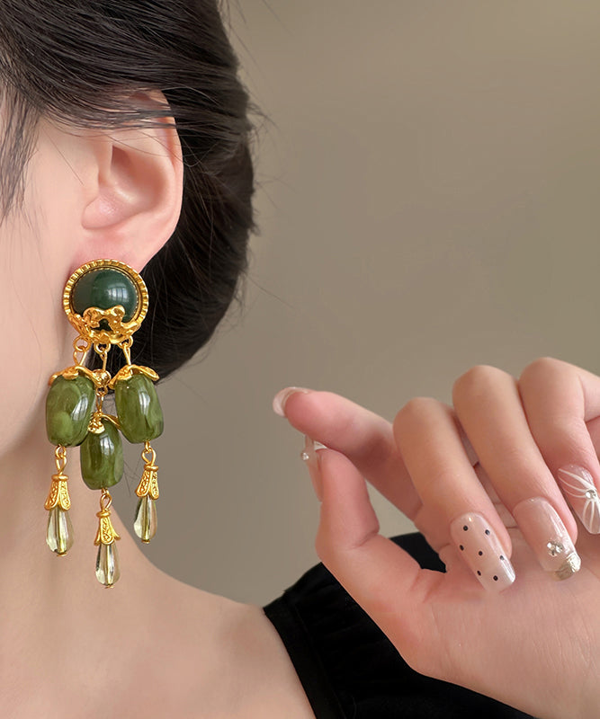 Chinese Style Green Alloy Jade Tassel Drop Earrings