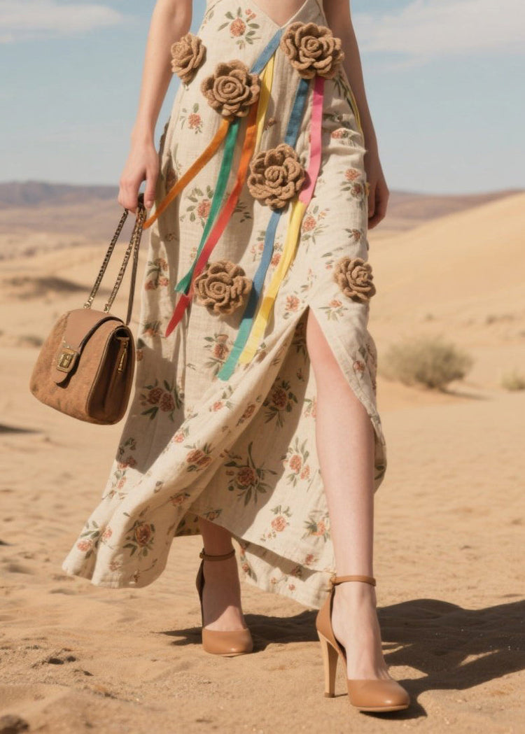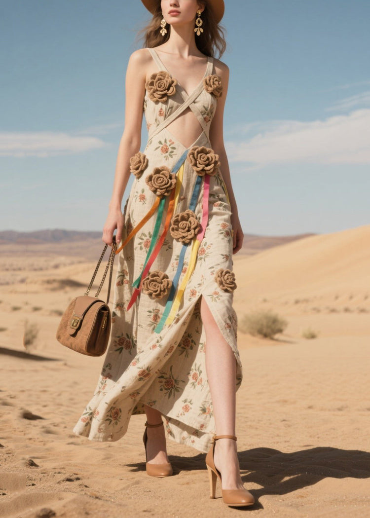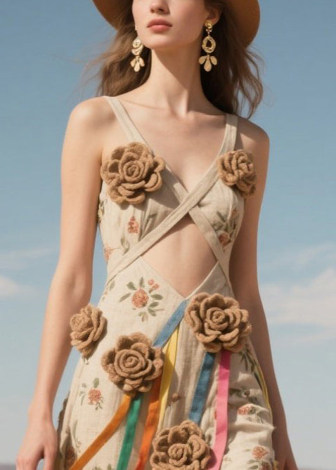 Classy Knitted Flower Hollow Out Side Open Cotton Cami Dress Summer