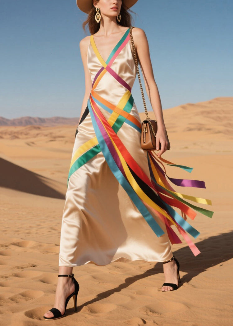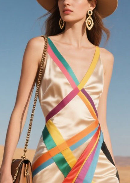Classy Nude Asymmetrical Patchwork Multicolour Ribbon Silk Sundress Summer