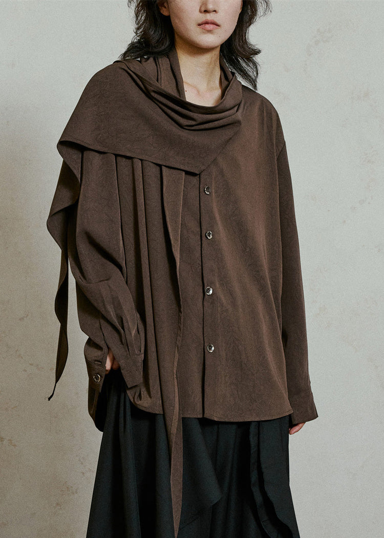 Coffee Wrinkled Button Solid Top Lantern Sleeve