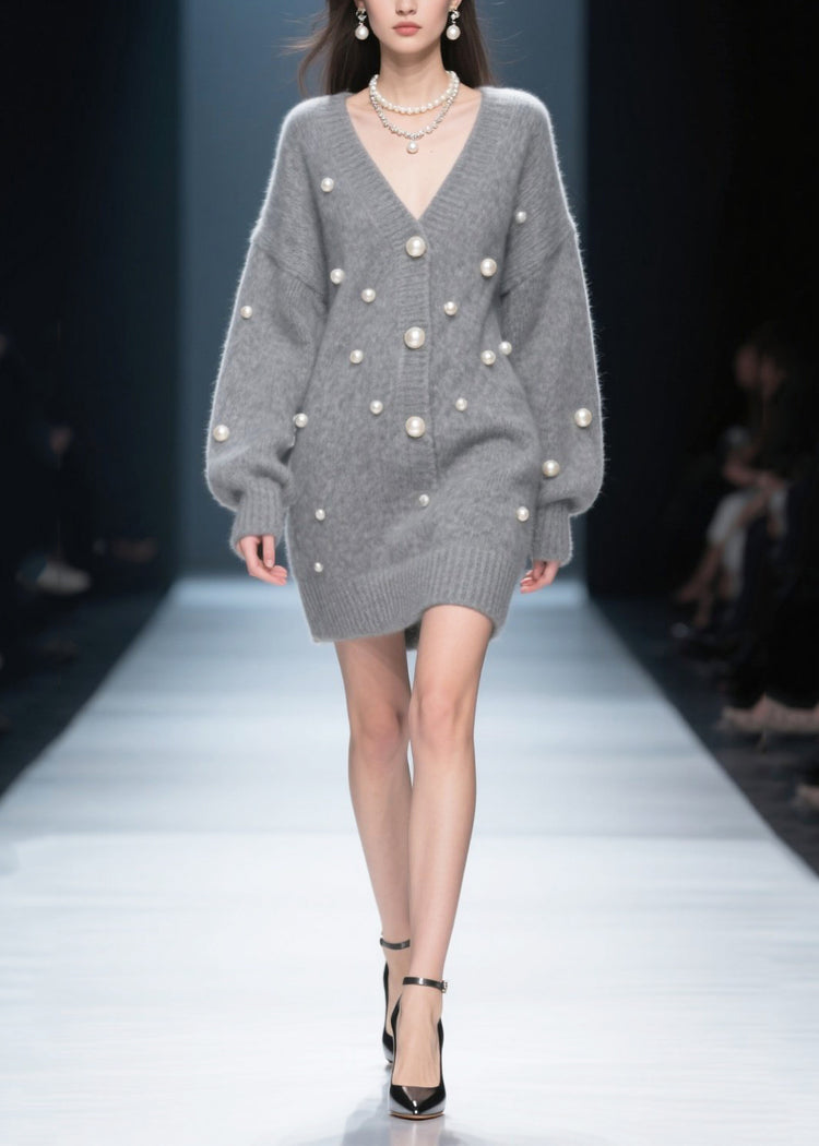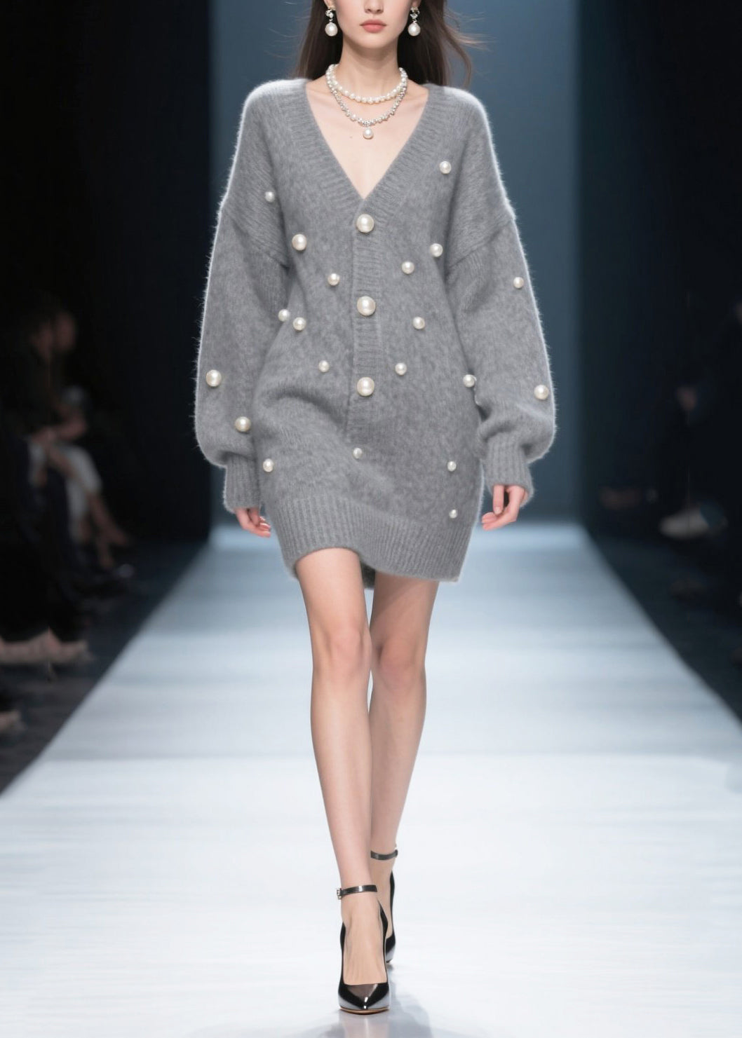 Cozy Grey V Neck Fine Pearls Thick Knit Dress Winter