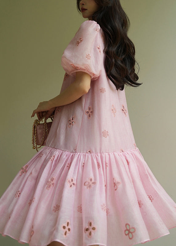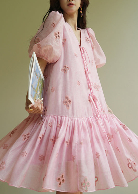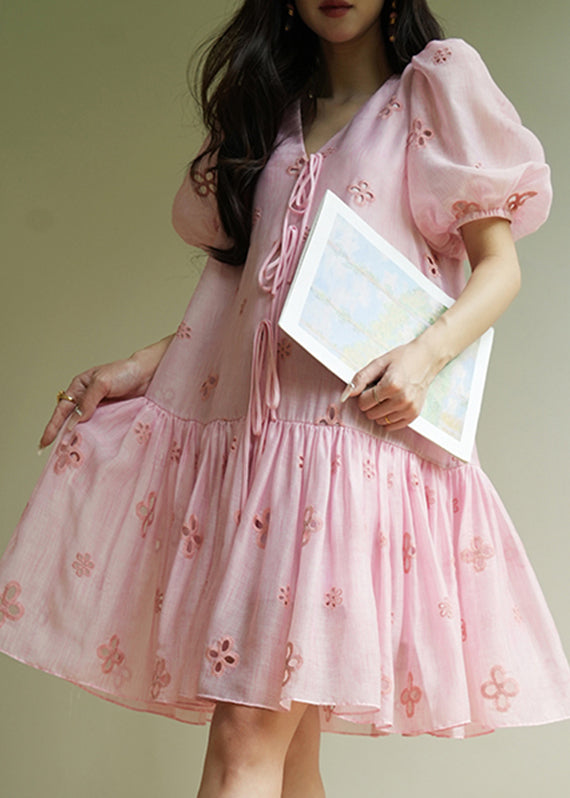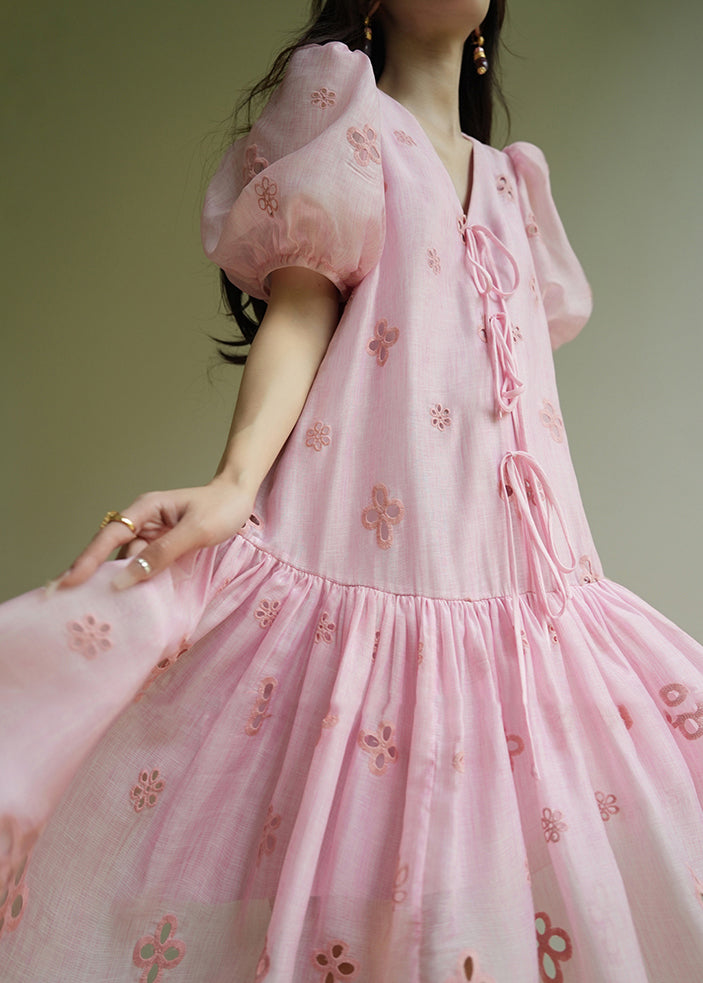 Cute Pink Embroidered Tie Lace Mid Dress Summer
