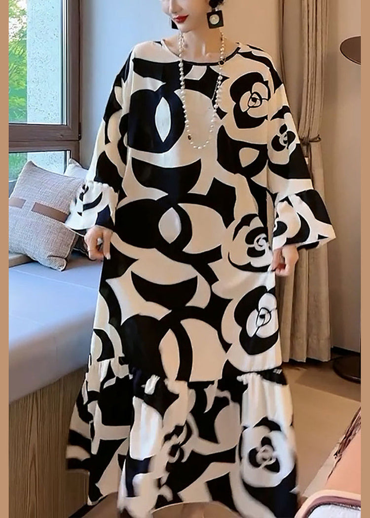 Elegant And Lazy Style Black And White Contrast Large Flower Floral Pattern Satin Texture Dress Flare Sleeve