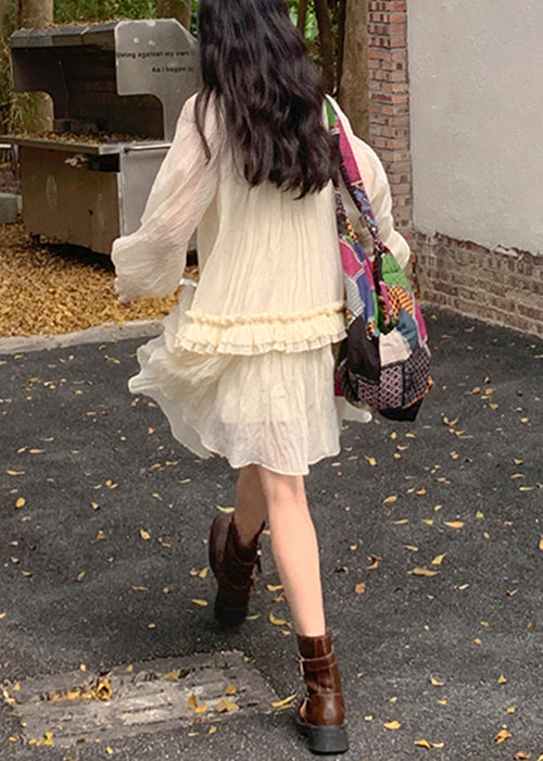 Elegant Apricot Lace Up Ruffled Silk Mini Dresses Fall