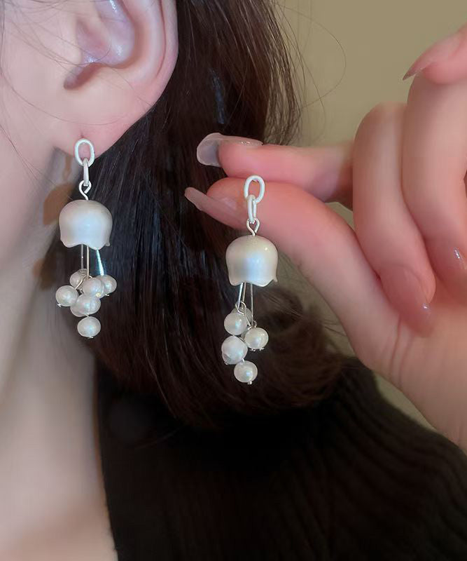Elegant White Sterling Silver Pearl Lily Of The Valley Tassel Drop Earrings