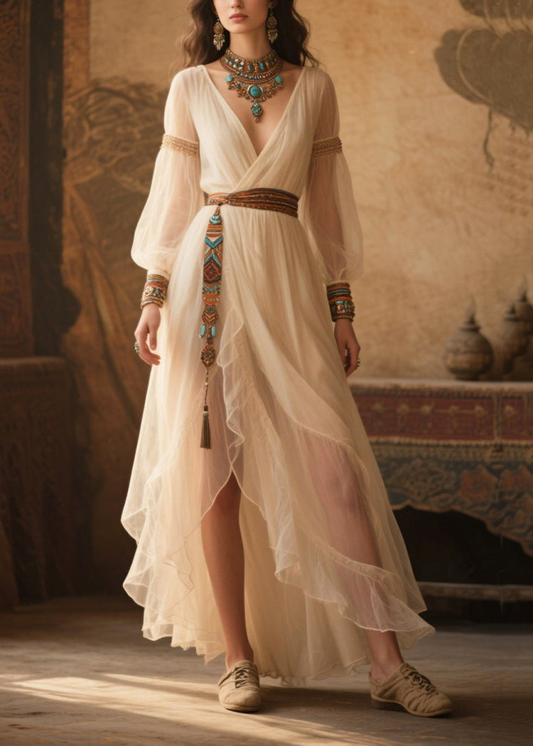 Ethnic Style White Tasseled Tulle Tunic Dress Summer