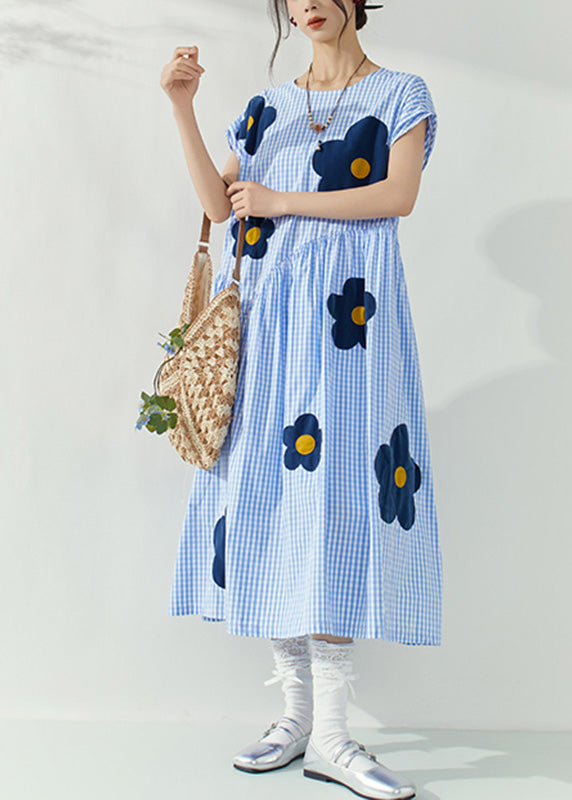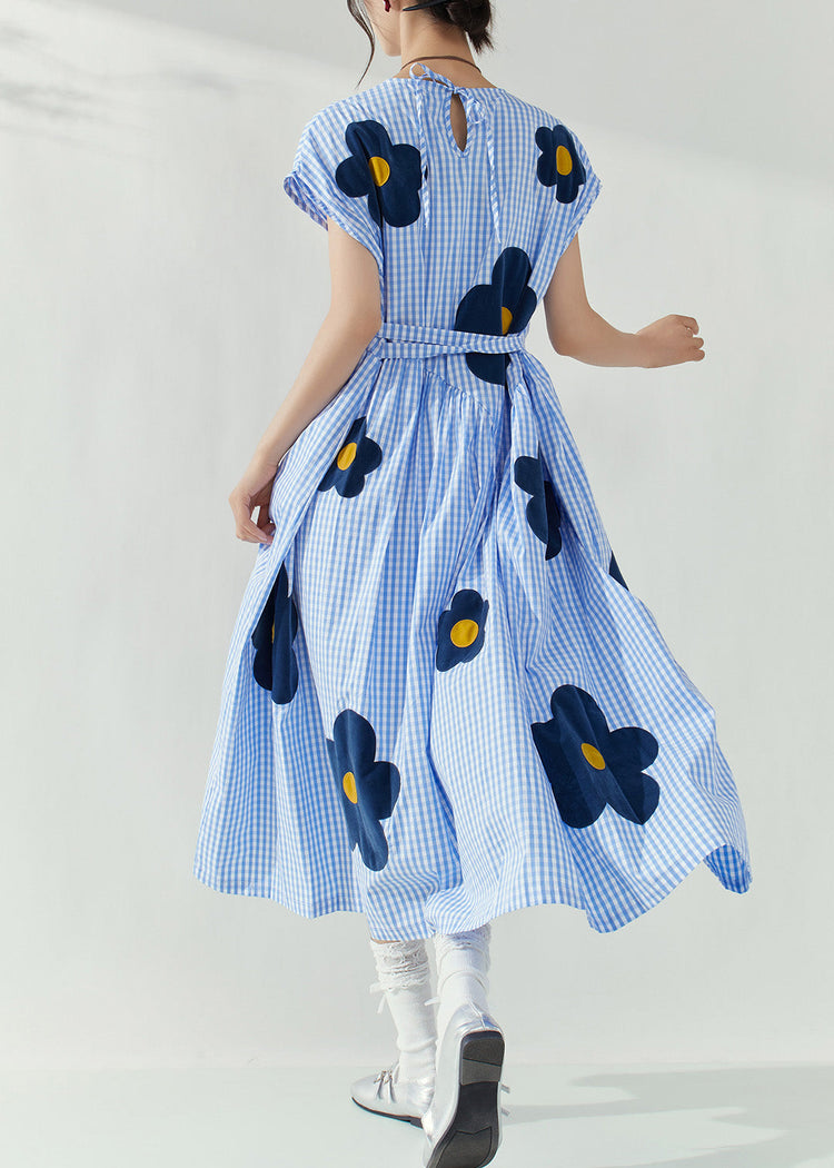 Fashion Blue O-Neck Plaid Tie Waist Floral Maxi Dresses Summer