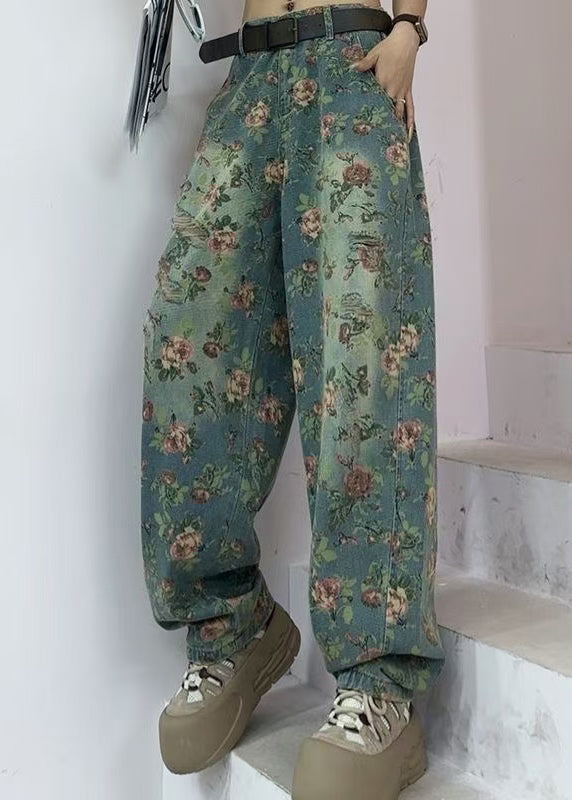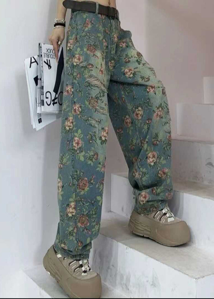 Fashion Tea Green Oversized Print Denim Pants Fall