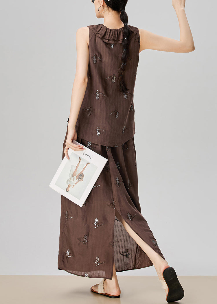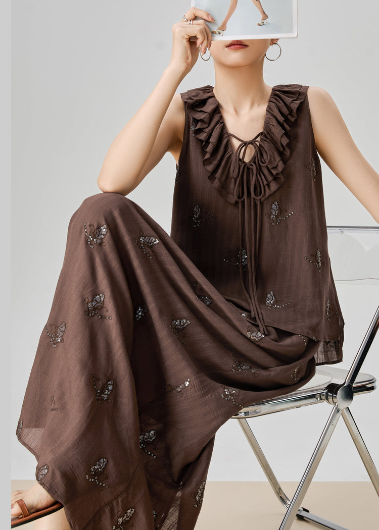 Fine Coffee Ruffled Print Lace Up Cotton Two Piece Set Sleeveless
