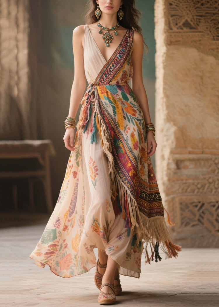 Fitted Beige Asymmetrical Tasseled Chiffon Cami Dress Summer