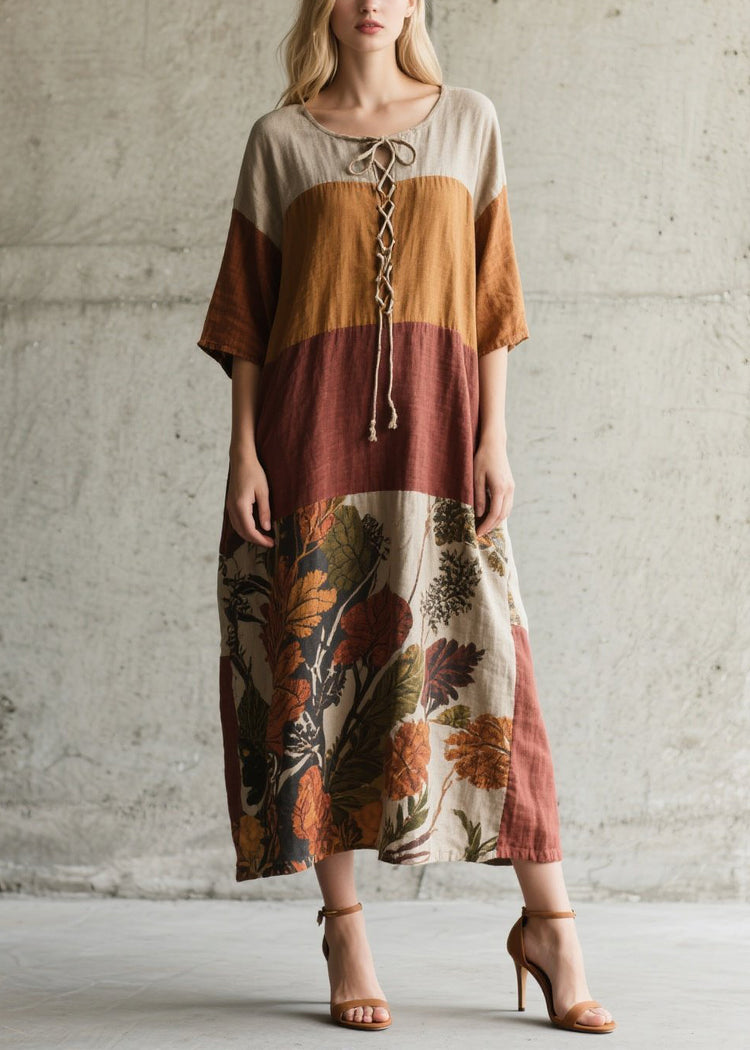 Fitted Colorblock Cross Strap Print Cotton Robe Dress Summer