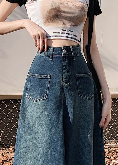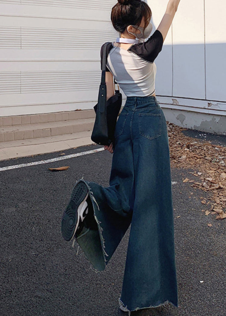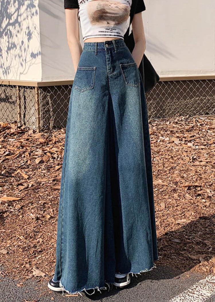 French Navy Denim Wide Leg Pants Tasseled Fall