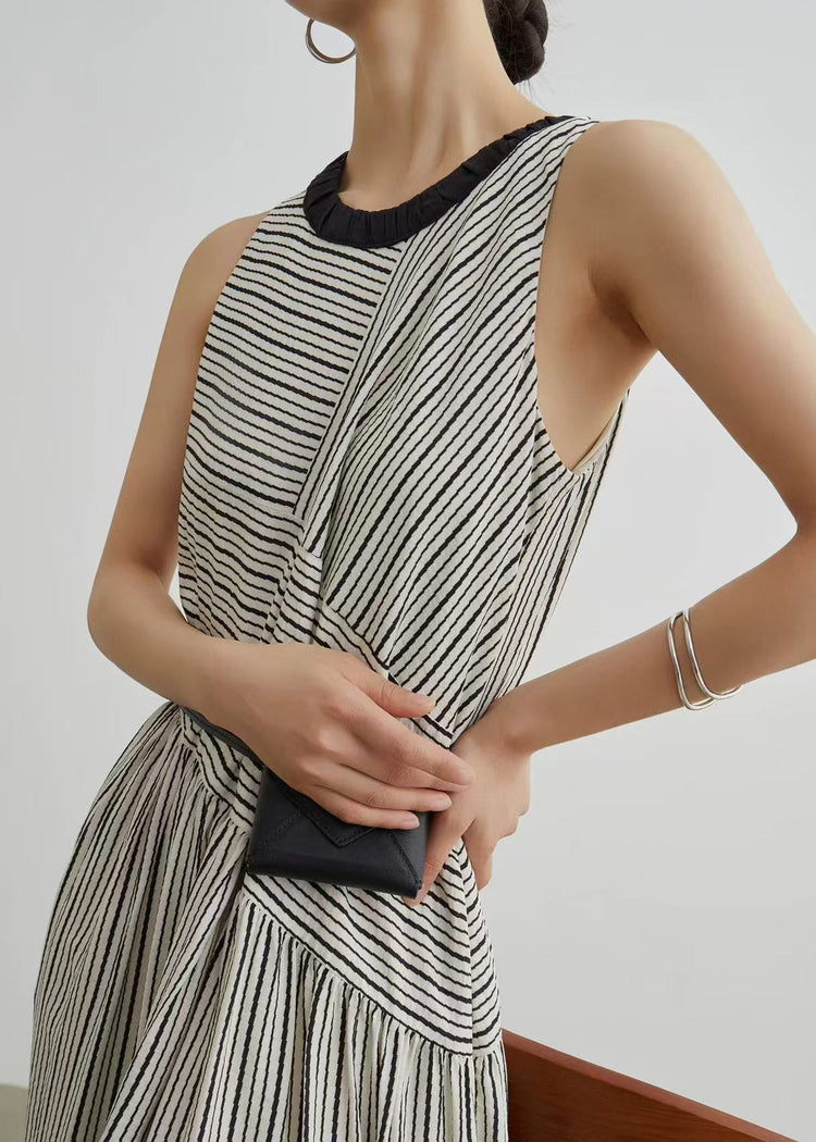 French Striped Pockets Patchwork Cotton Long Dresses Sleeveless