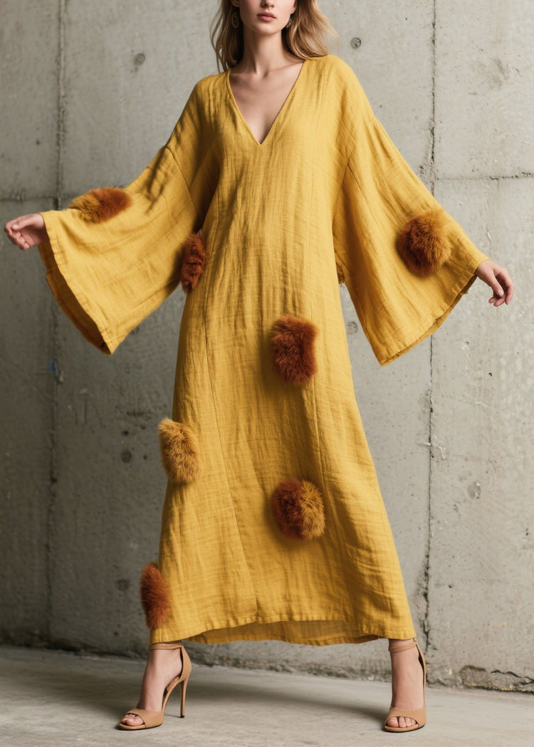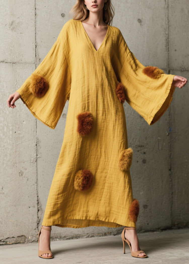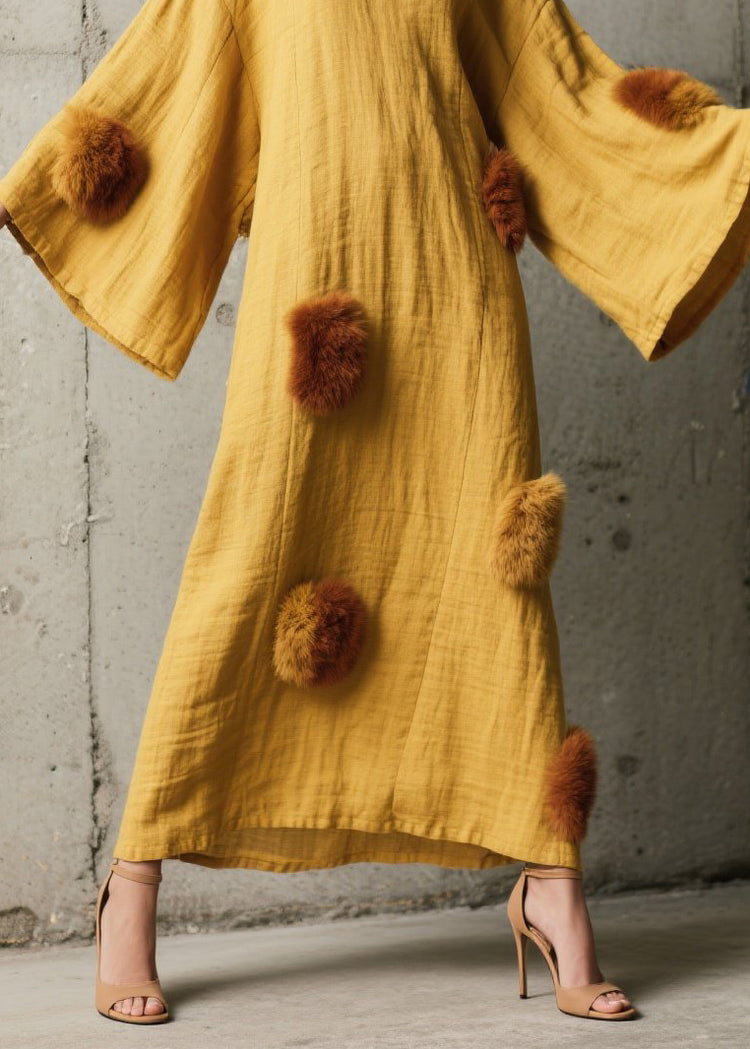 French Yellow V Neck Fuzzy Fur Patchwork Cotton Dress Fall