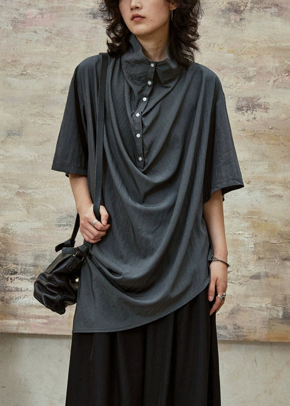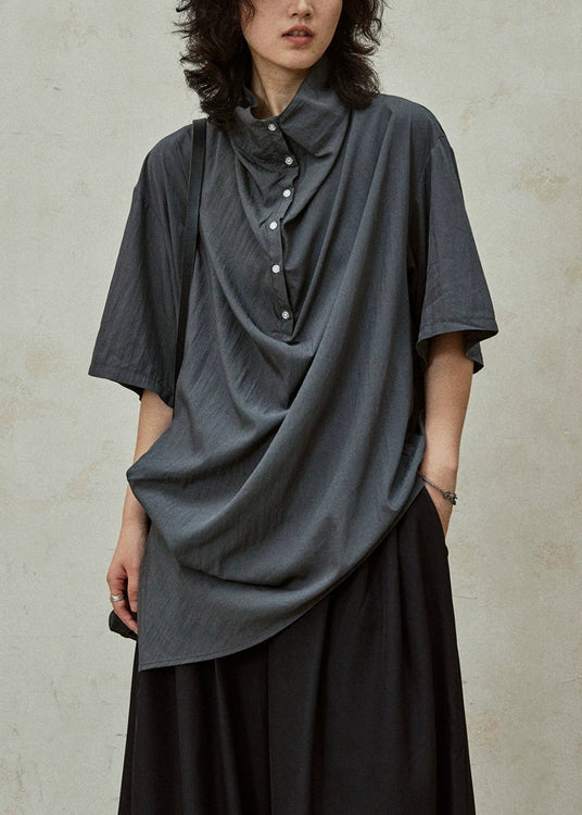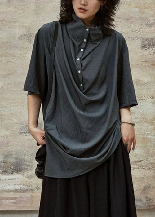 Grey Button Side Open Cotton Blouse Stand Collar Summer