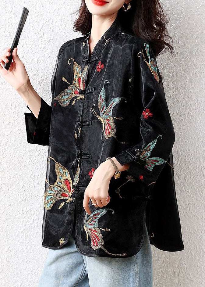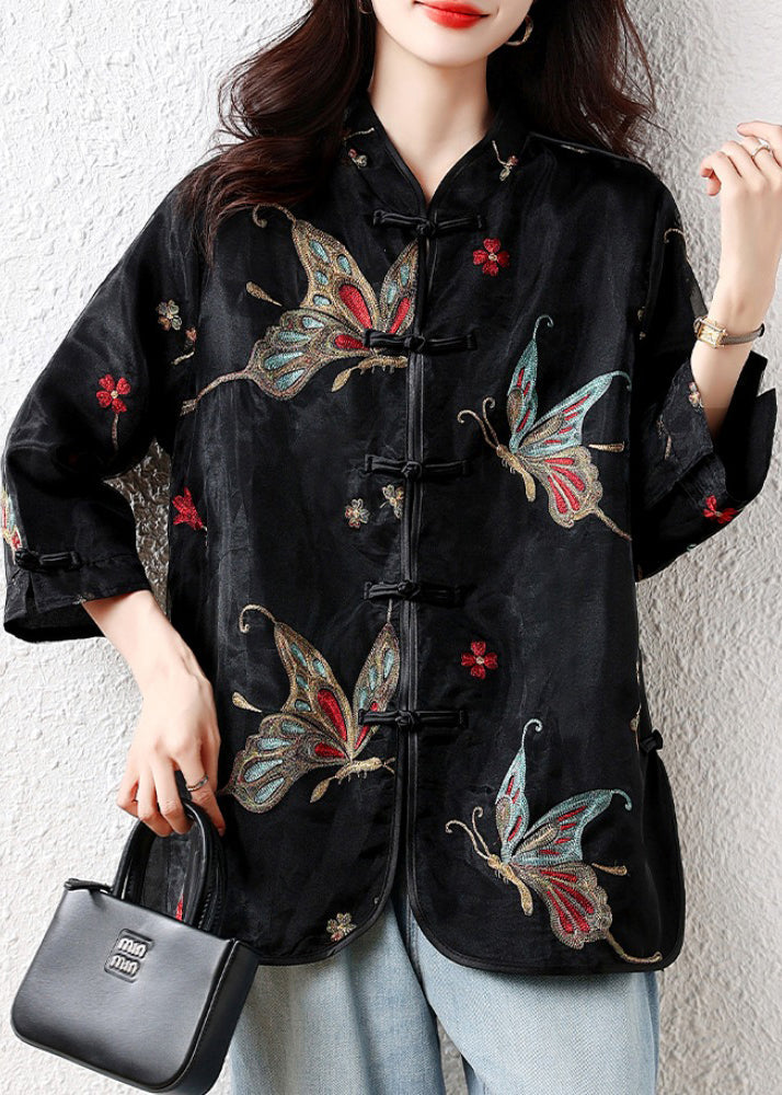 Handmade Black Embroidered Button Tulle Patchwork Silk Velour Blouses Fall