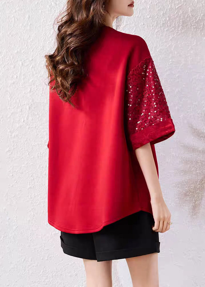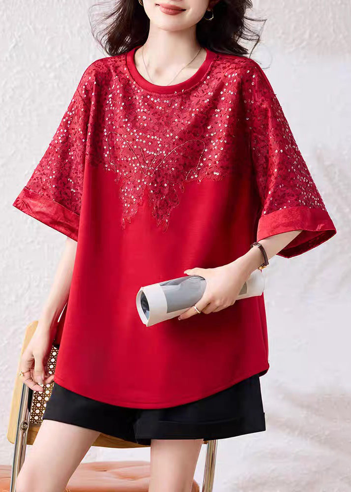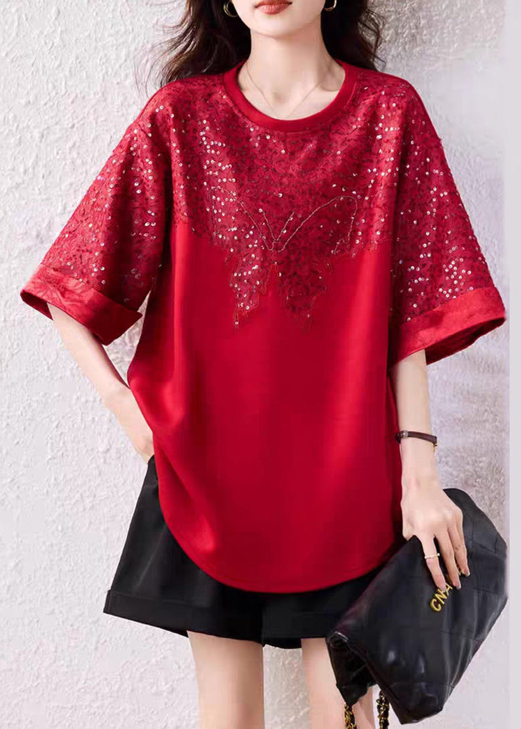 Handmade Red O Neck Sequins Cotton T Shirt Summer