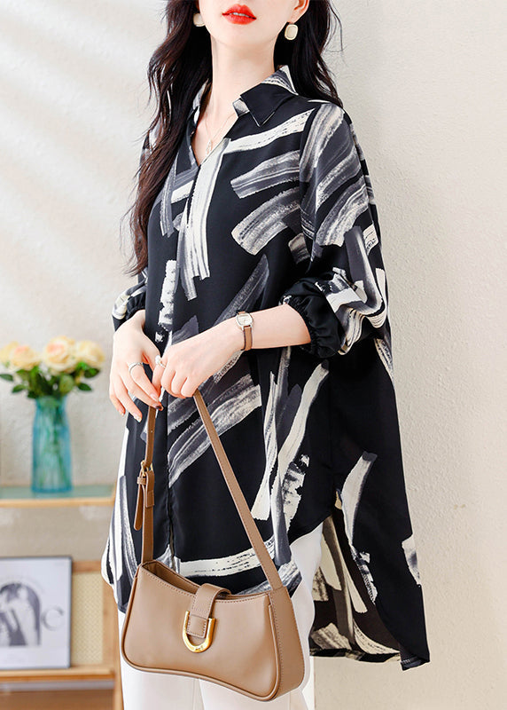 Italian Black V Neck Print Side Open Chiffon Shirt Fall