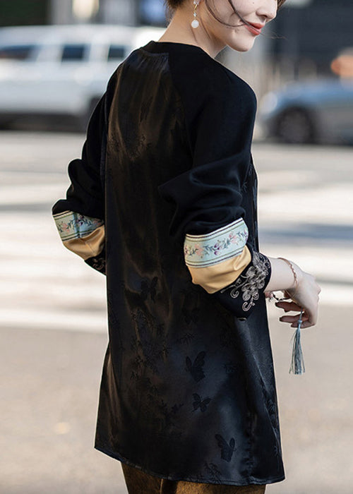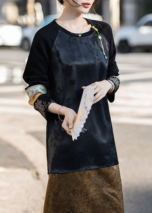 Jacquard Black Embroidered Patchwork Silk Shirt Fall