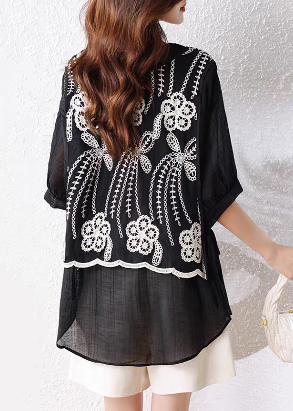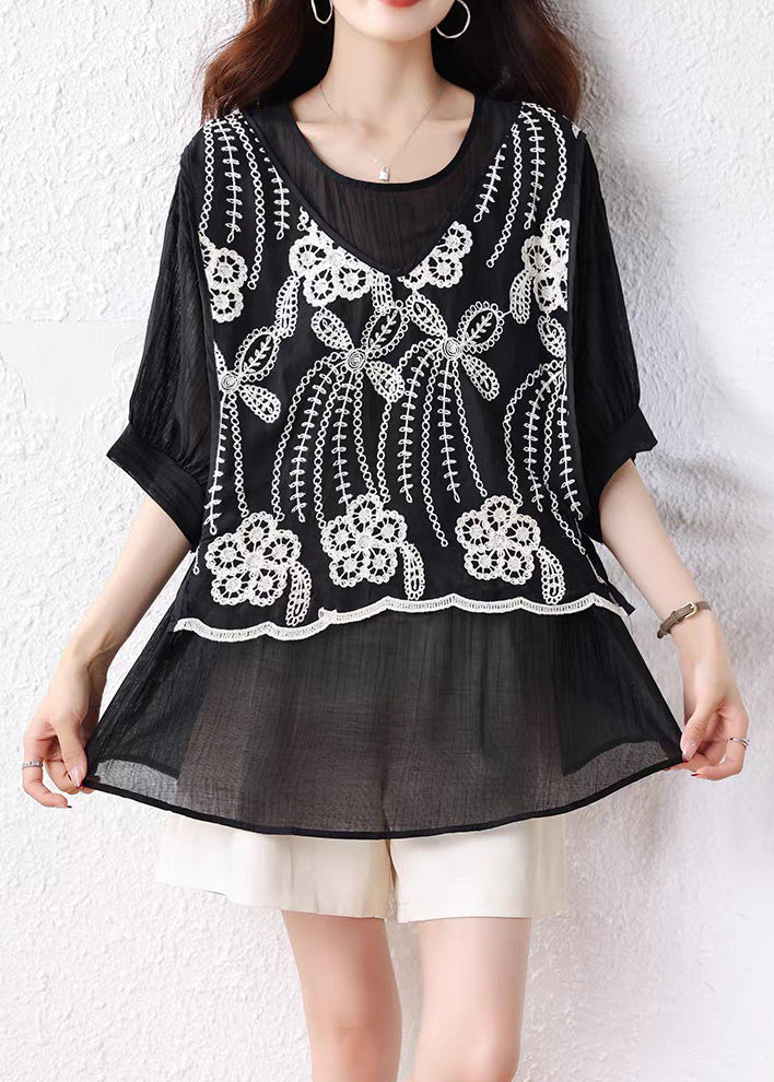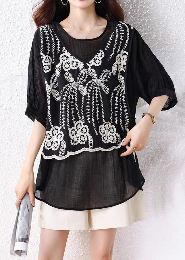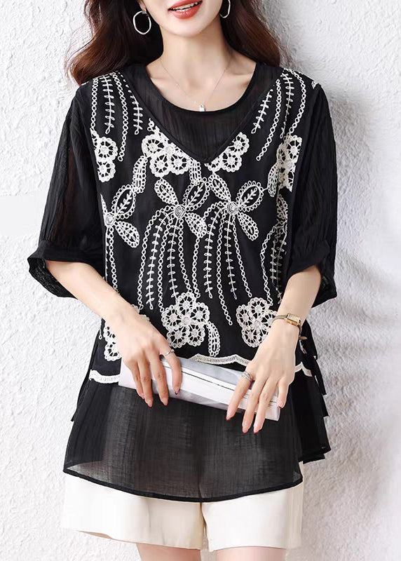 Loose Black False Two Pieces Lace Up Cotton T Shirts Half Sleeve