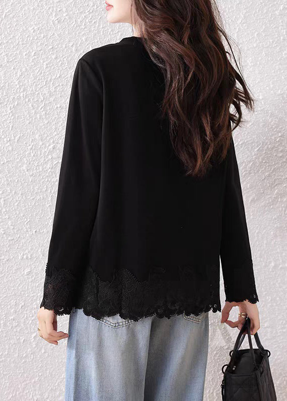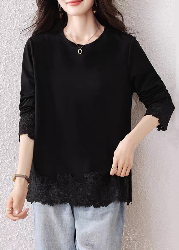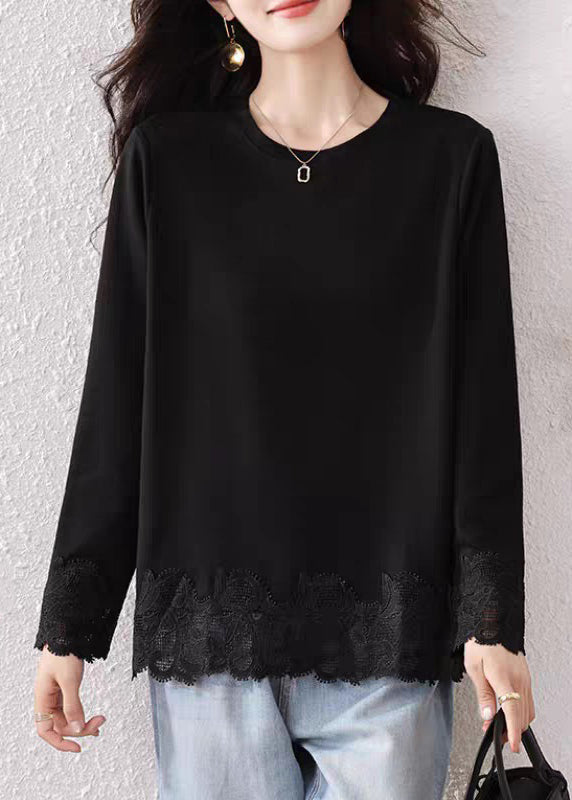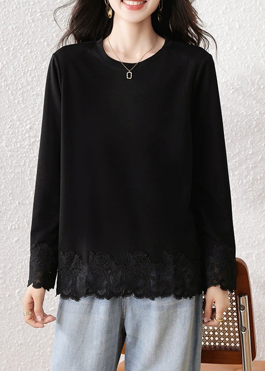 Loose Black O Neck Lace Patchwork Cotton T Shirt Fall