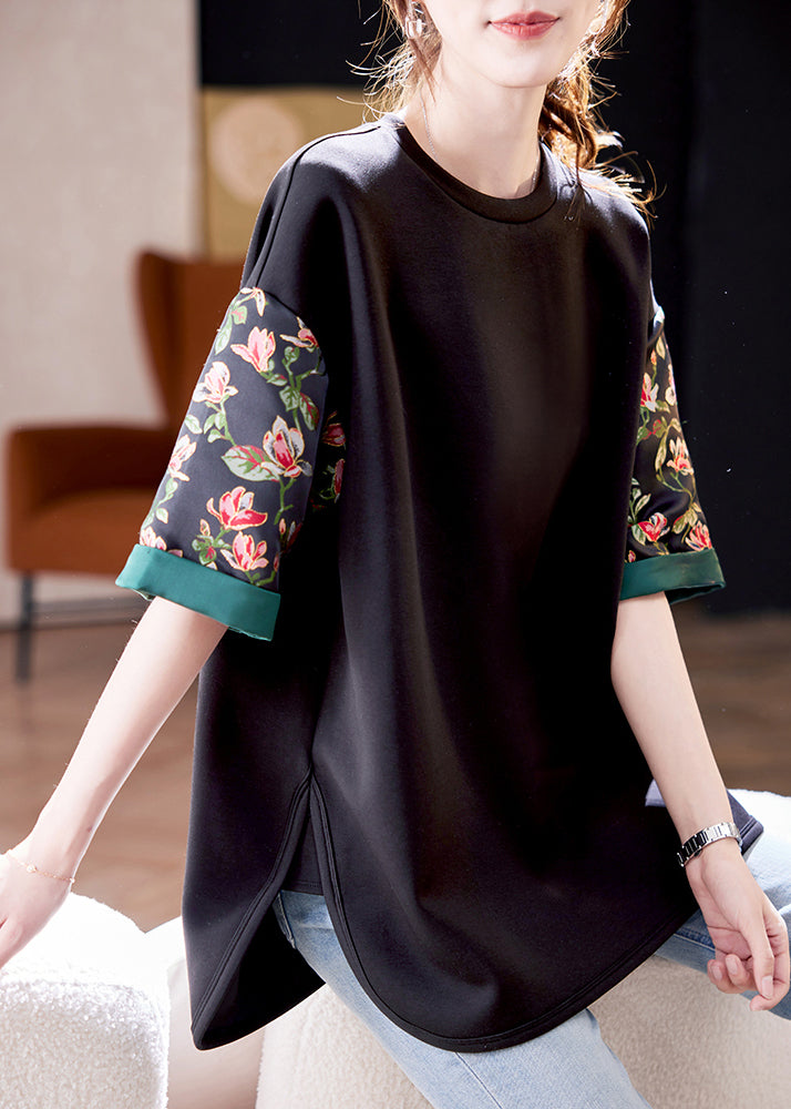 Loose Black O Neck Print Side Open Cotton T Shirts Summer