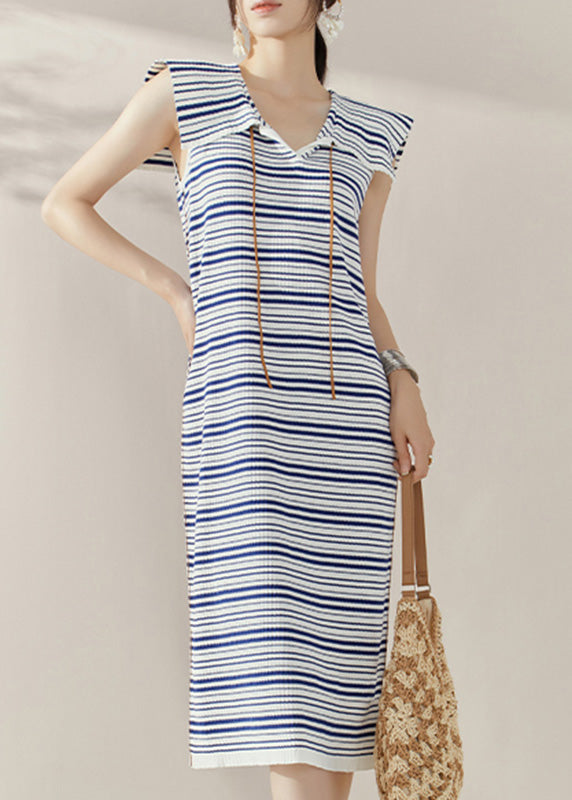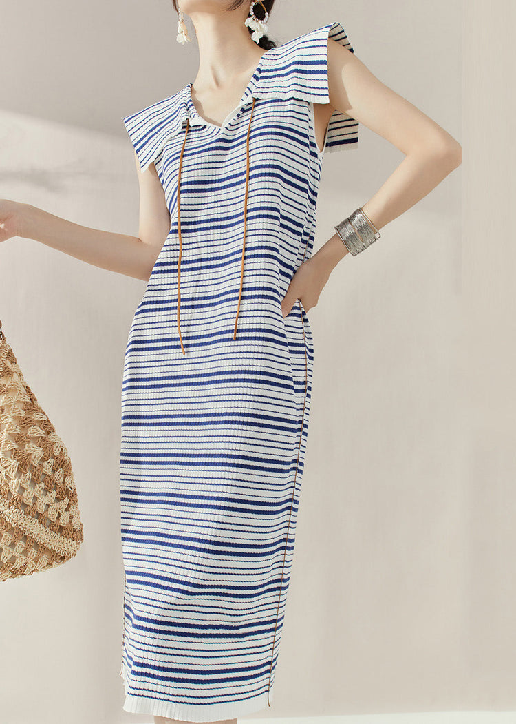 Loose Blue Sailor Collar Striped Knit Long Dresses Sleeveless