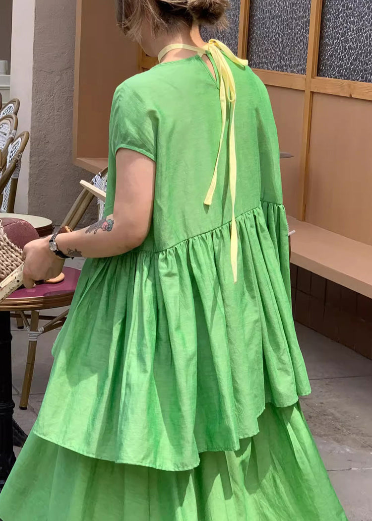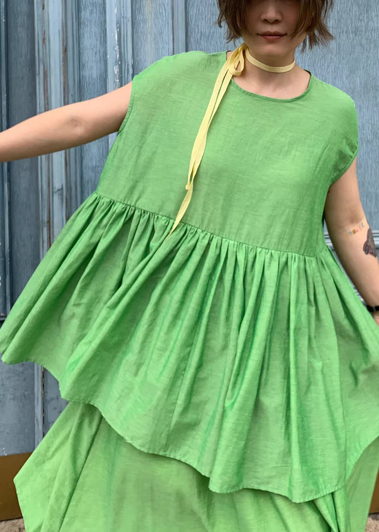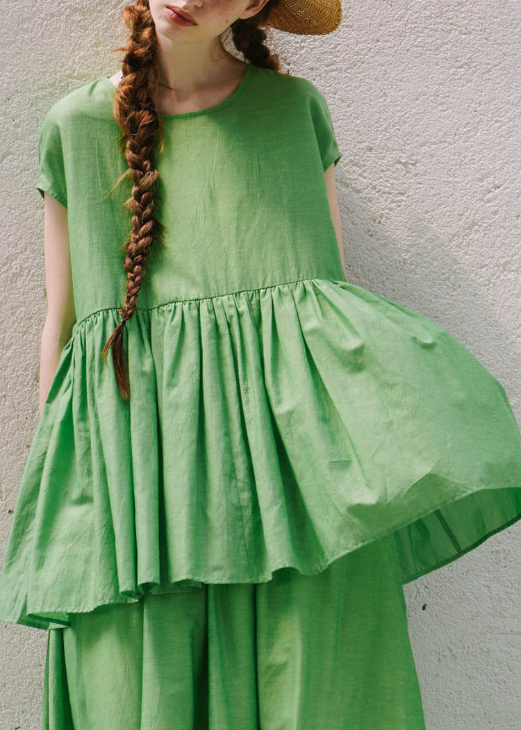 Loose Green O-Neck Wrinkled Solid Cotton Shirts Summer