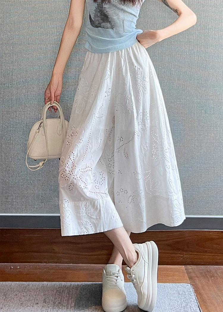 Loose White Hollow Out Pockets Elastic Waist Cotton Crop Pants Summer