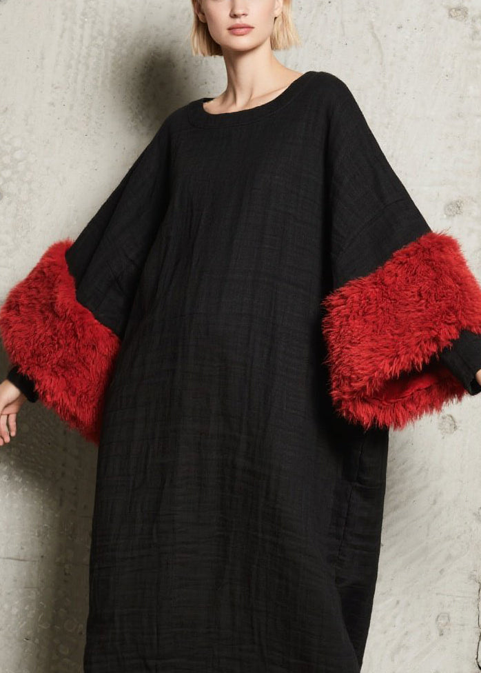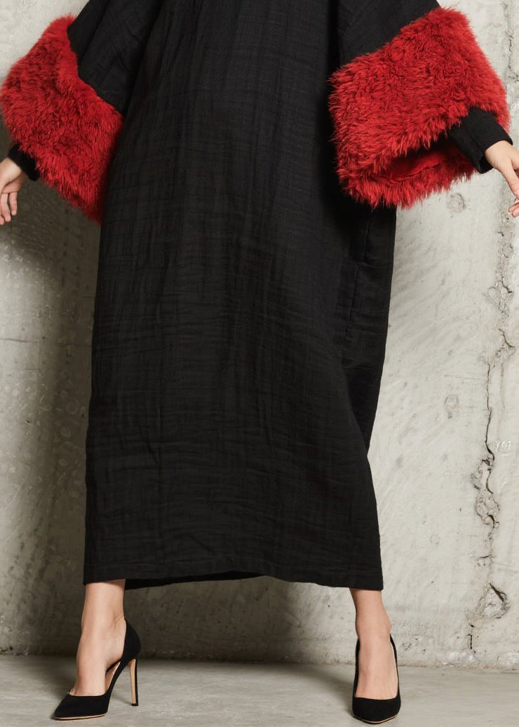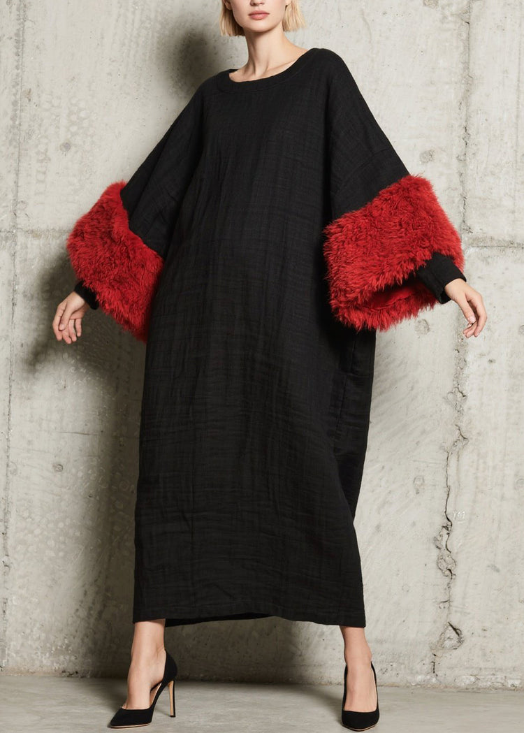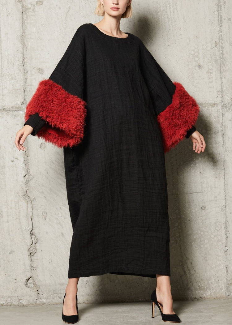 Modern Black O Neck Fuzzy Fur Patchwork Cotton Dress Fall