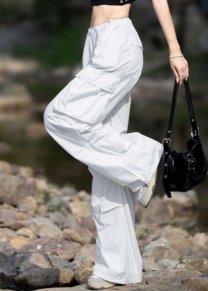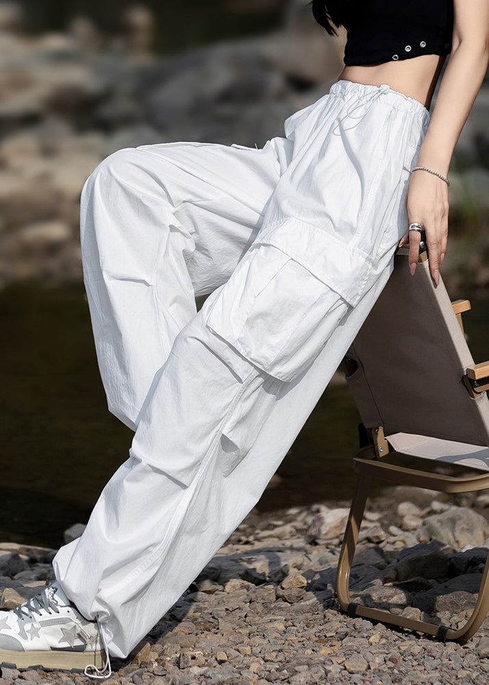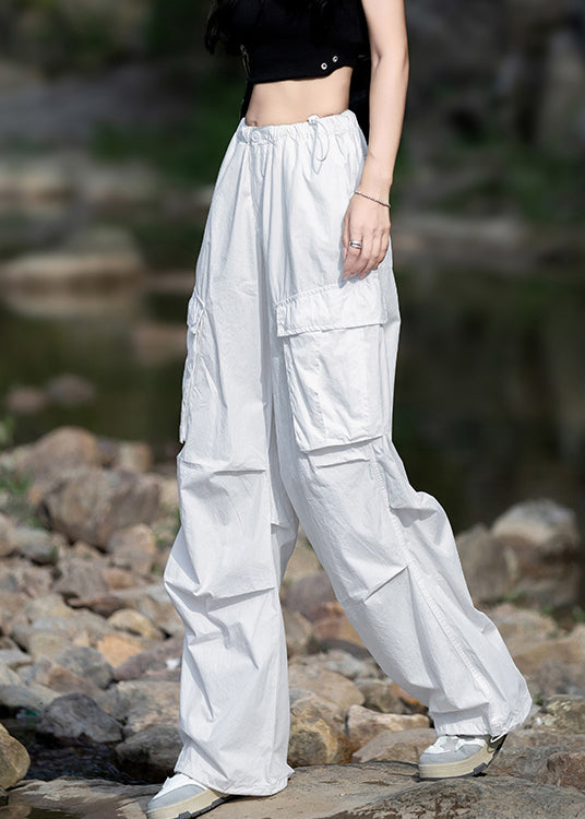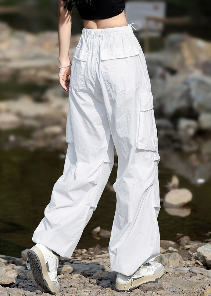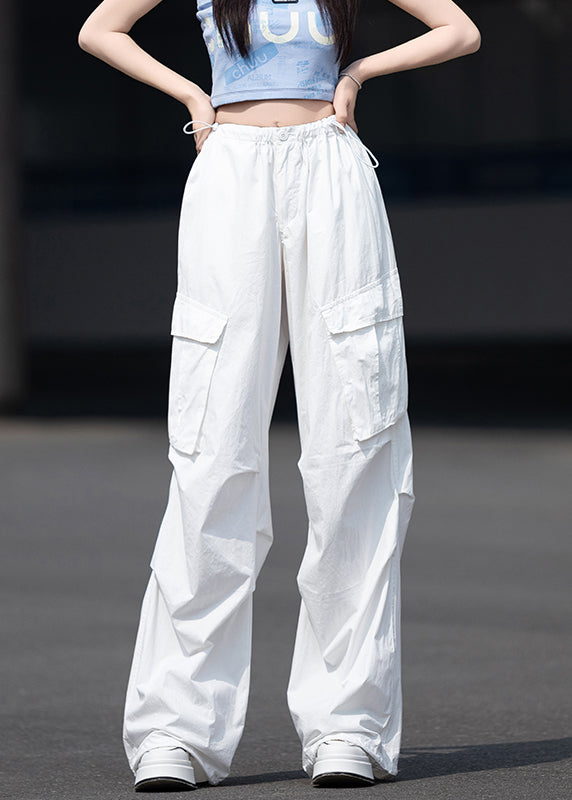 Modern White Pockets Elastic Waist Drawstring Cotton Pants Fall