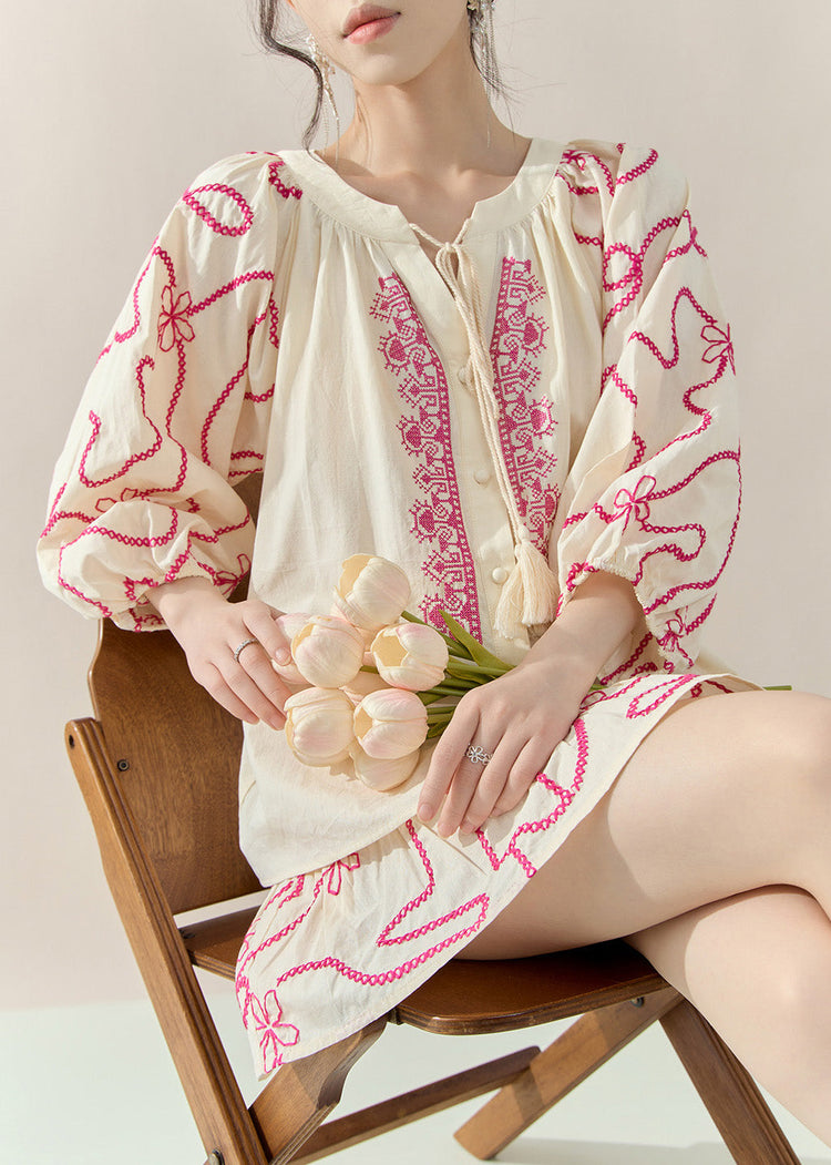 Natural Apricot O-Neck Embroidered Top And Skirts Two-Piece Set Fall