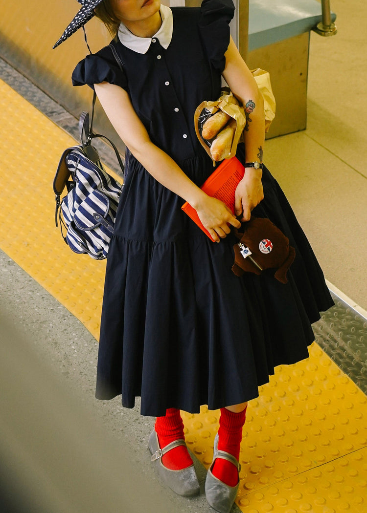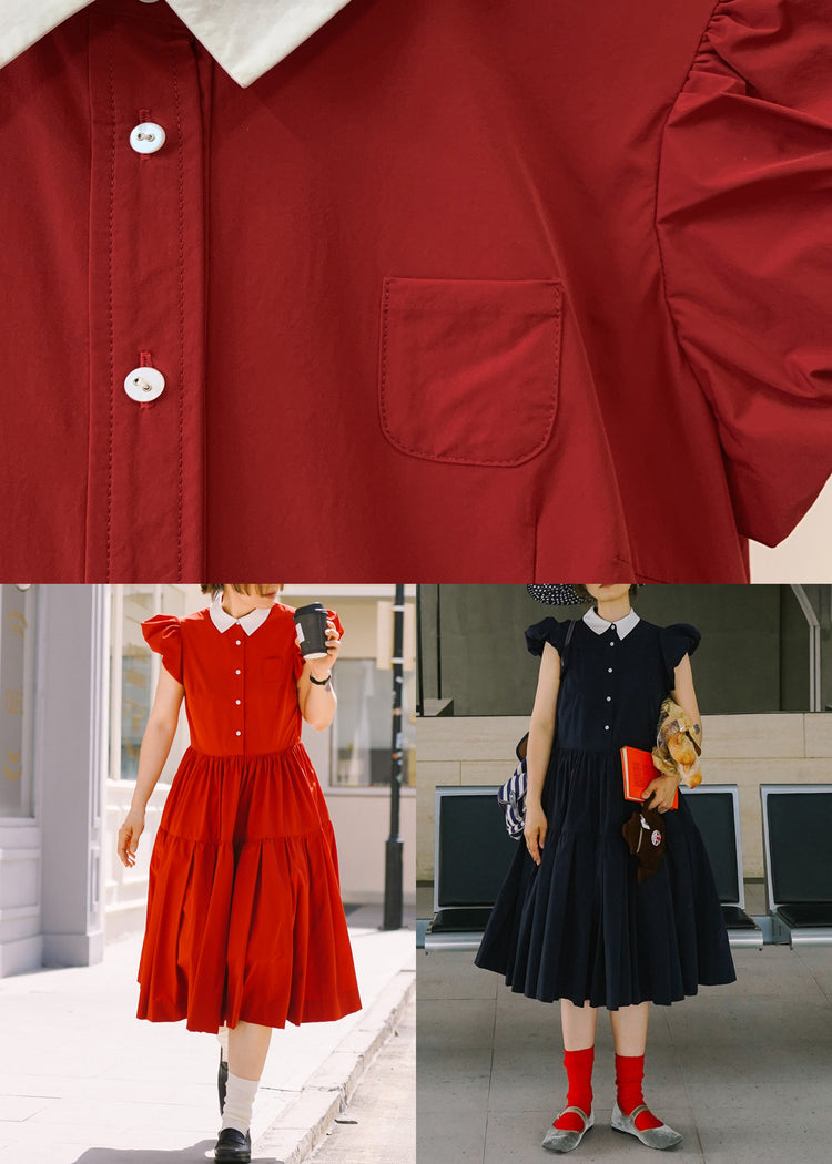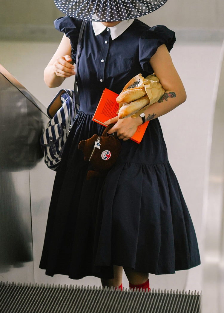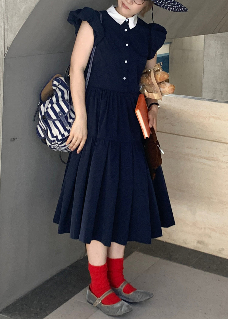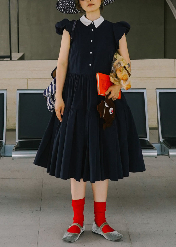 Navy Button Pockets Cotton Dress Peter Pan Collar Puff Sleeve