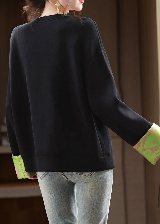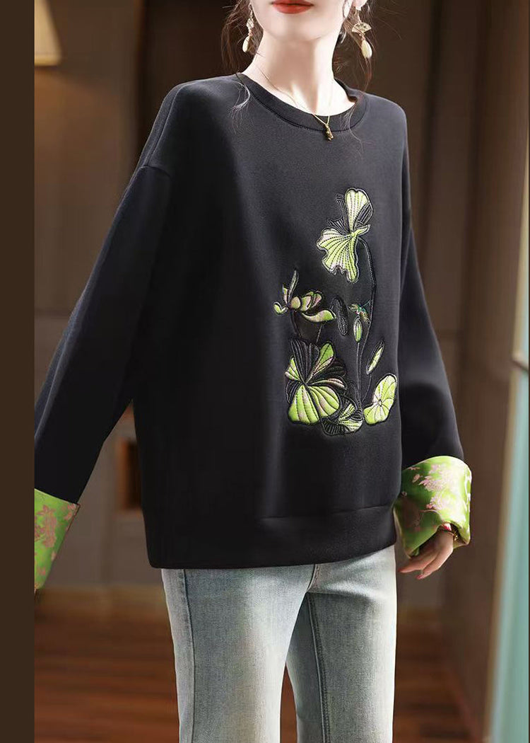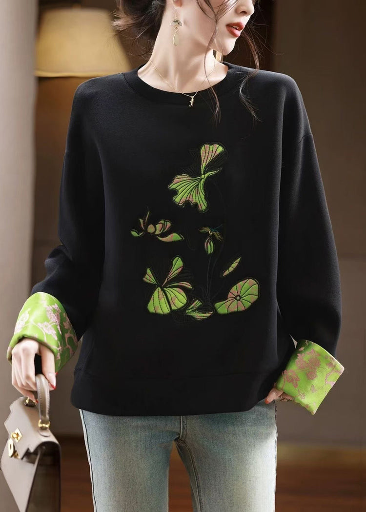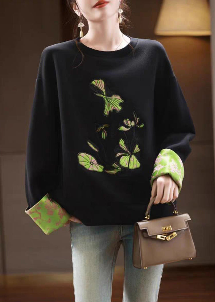 New Black O Neck Embroidered Patchwork Cotton Sweatshirts Fall